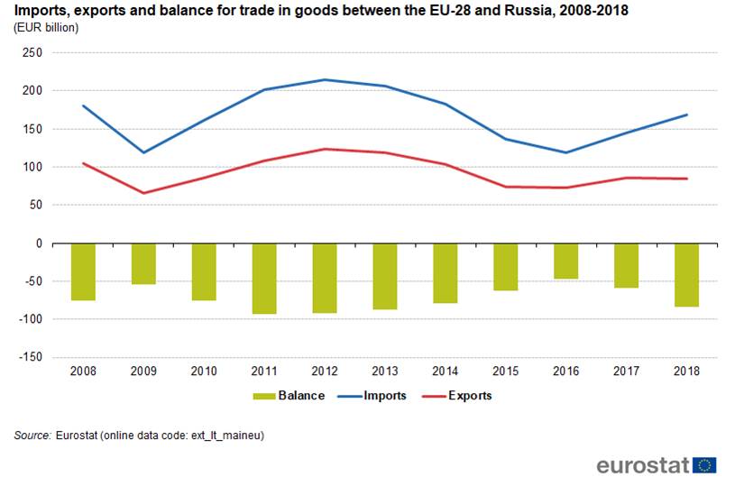 У період з 2008 по 2018 рік ЄС дефіцит торгівлі з Росією зменшився (мається на увазі, що блок імпортував більше, ніж експортував). Цей дефіцит торгівлі був найвищим у 2011 році – 93 мільярди євро та найнижчим у 2016 році – 46 мільярдів євро. У 2018 році дефіцит торгівлі ЄС з Росією склав 83 мільярди євро.