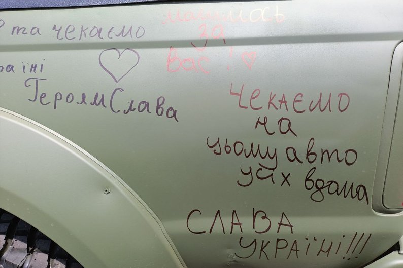26 травня в Луцьку на проспекті Волі, куди привезли авто, організували акцію, в рамках якої перехожі залишали на кузові побажання для військових.Лучанка Світлана Колбут каже: про акцію та збір коштів на цей автомобіль дізналася від дітей.