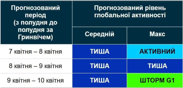 Очікується, що геомагнітні умови будуть спокійними 8 і 9 квітня, проте вже під кінець 10 числа новий високошвидкісний потік з корональної діри досягне нашої планети.