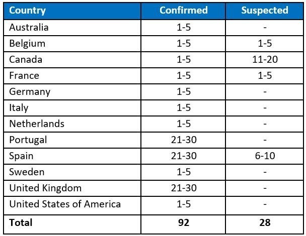 Станом на 21 травня Всесвітня організація охорони здоров’я (ВООЗ) зафіксувала 92 підтверджені випадки та 28 імовірних випадків віспи мавп.