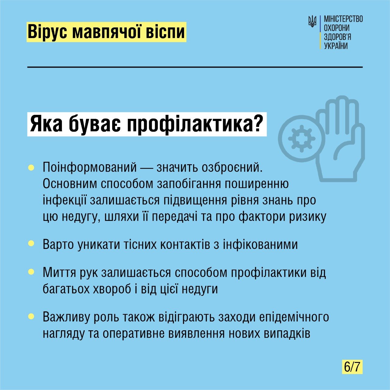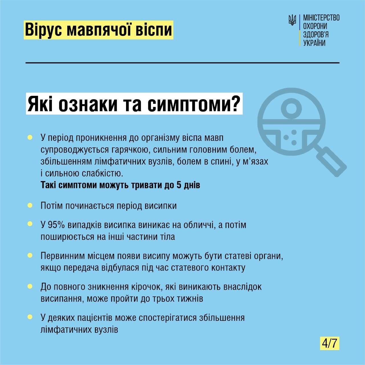 Крім того, у міністерстві оприлюднили інфографіку, де зібрано всю відома на сьогодні інформацію — відповіді на найпоширеніші запитання стосовно цього захворювання: як передається хвороба, які ознаки та симптоми має, а також яка профілактика і діагностування віспи мавп.