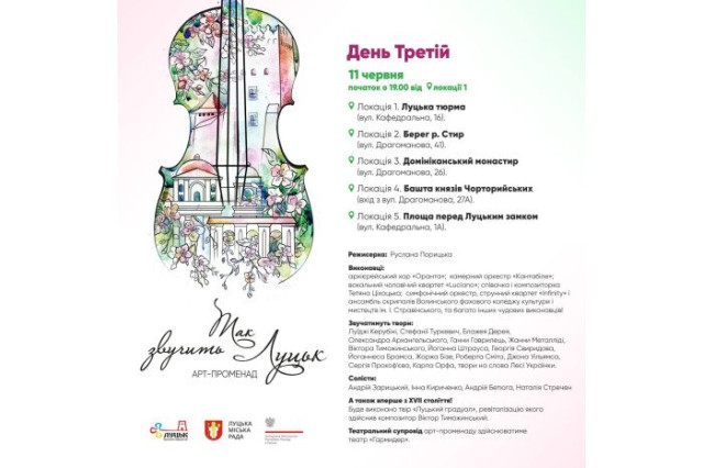 Третій день відкриє для глядачів нові локації старого Луцька на фоні чудової музики. Завітайте на арт-променад, щоб почути, як вишукано звучить архітектура, і побачити, яка велична музика.