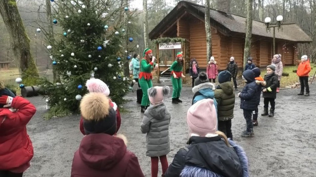 Надворі біля новорічної ялинки ельфи та білий ведмідь розважають гостей резиденції Санти. Порозважатися біля ялинки до школярів виходить і сам Святий.