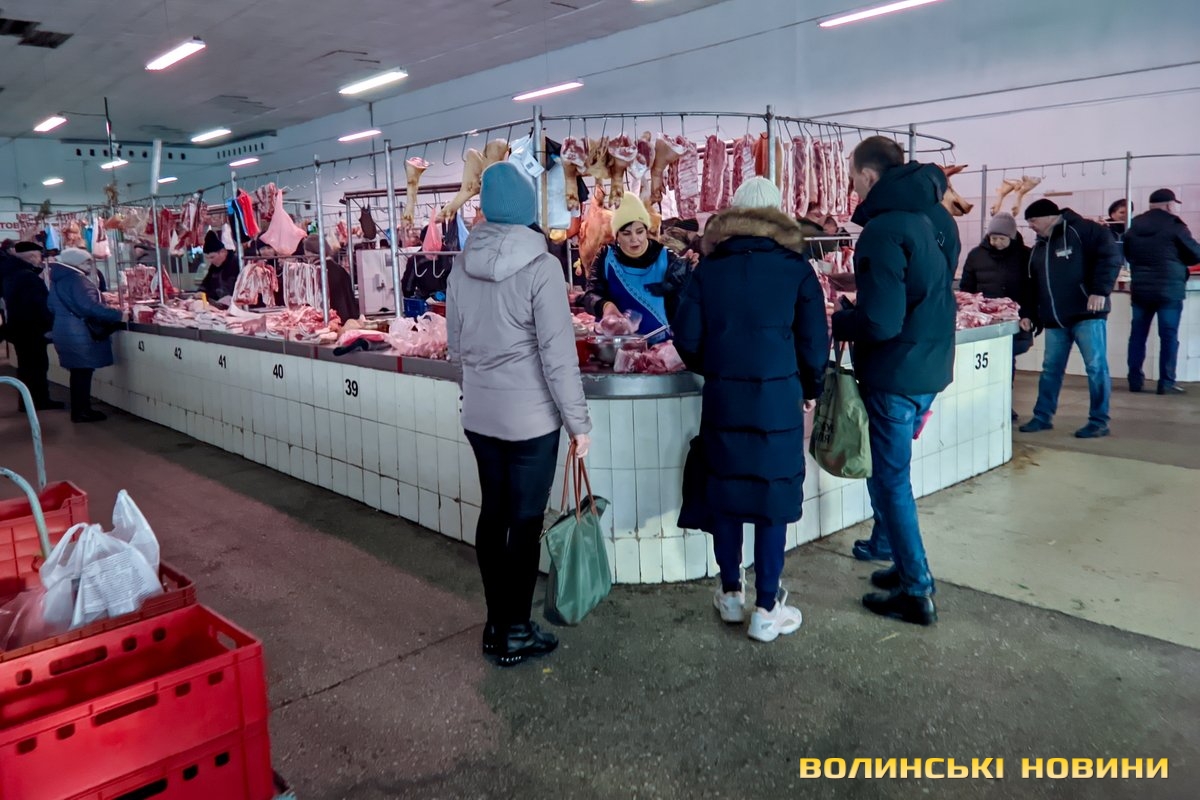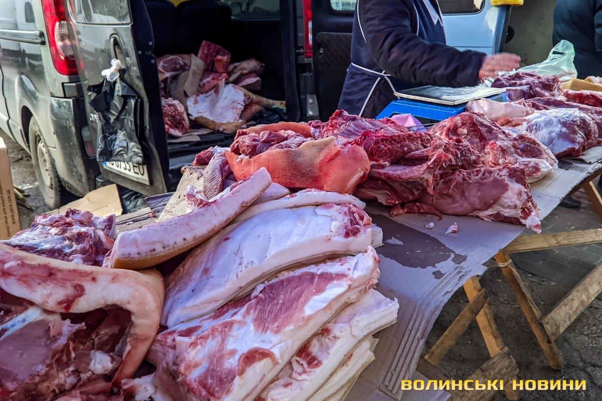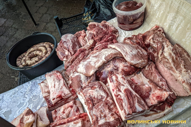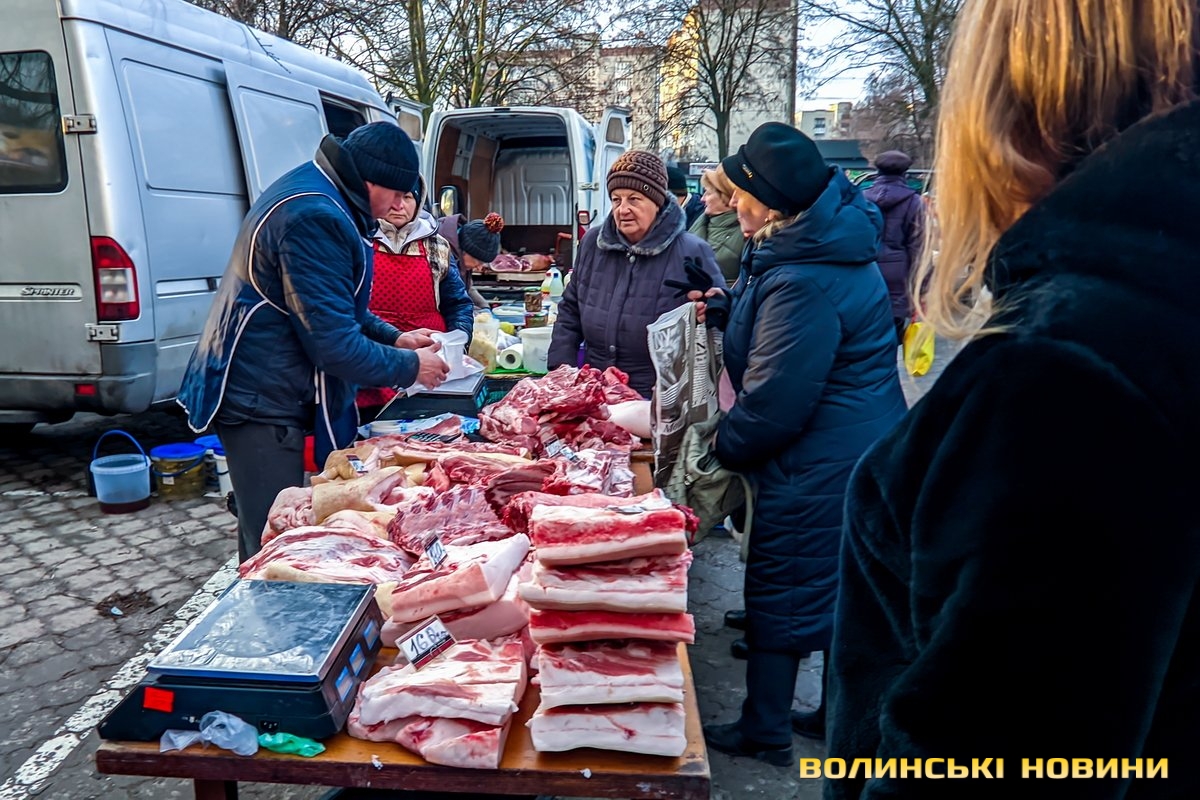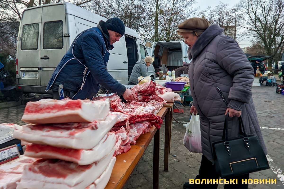 Ярмарок біля «Глобуса» традиційно зустрічає лучан найбільшим різноманіттям крафтової продукції. Раніше її назвали б просто домашньою. Звісно, напередодні Нового року люди найбільшу увагу звертають на м’ясні вироби. Проте загалом покупців на ярмарку доволі небагато, як на передноворічний день. Чи то війна далася взнаки, чи то ціни відлякують. Чесно кажучи, у звичайну суботу буває значно більше людей.Тим не менше торг іде. Свинячу печінку пропонують по 70 гривень. Шинка йде по 180 гривень. За лопатку просять 180 гривень за кілограм. Вирізка коштує 175–180 гривень. В іншому місці вирізку віддають за 220 гривень (якщо купити цілий шматок, а він чималенький), якщо ж різатимуть, то треба заплатити вже по 240 гривень за кіло. Свинячі ребра коштують по 160 гривень. У кожного продавця м’ясива є бочок. Його пропонують за ціною 150–160 гривень.Не бракує й готової продукції, яку можна взяти одразу до столу. Печений бочок обійдеться у 240–270 гривень за кіло, ребра – у 250, ковбаса – у 300, шинка – 300–350. Можна купити й копчені вуха до пива – по 160 гривень за кіло. Готові ковбаси (на кшталт салямі, дрогобицької тощо) коштують 230–280 гривень. Любителі кров’янки можуть купити її по 110 гривень. Продавці пропонують її з гречкою та рисом. Картоплянка (терта картопля запечена у кишці) йде по 60–80 гривень. Сальтисон обійдеться у 150 гривень.Можна прикупити й домашньої сирої ковбаси, яка аж проситься на деко. Продають таку по 175 гривень. Сало залежно від товщини цінять по 160–190 гривень.А от на «Варшавці» потік покупців був куди більший. Ціни трохи відрізняються від ярмарку біля «Глобуса», але загалом теж без значних перепадів від продавця до продавця. Скажімо, свіже сало траплялося й по 200 гривень. Бочок ішов по 150–165 гривень. За шию просили 165 гривень за кіло. Свиняча лопатка коштувала 155 гривень, шинка – 160 гривень.. Домашня сира ковбаса – по 180 гривень.Лише поодинокі продавці пропонували телятину чи яловичину. Телячу шинку віддавали за 200 гривень. Стільки ж коштувала яловича. Хоча різні частини яловичої туші продавали й дешевше – було до продажу м’ясо і по 130 гривень.Пропонували селяни й курей та іншу птицю. Скажімо, за качку продавчиня просила 650–700 гривень. Півлітрова банка хрону (куди ж без нього!) коштує 70 гривень. За вполовину менший пакетик треба заплатити 35 гривень.