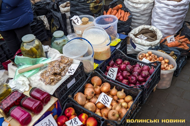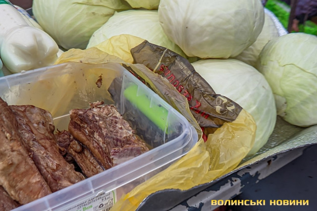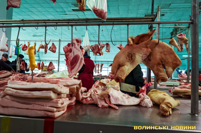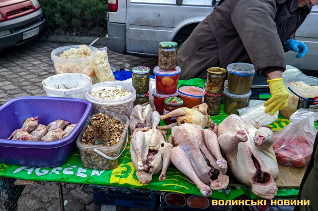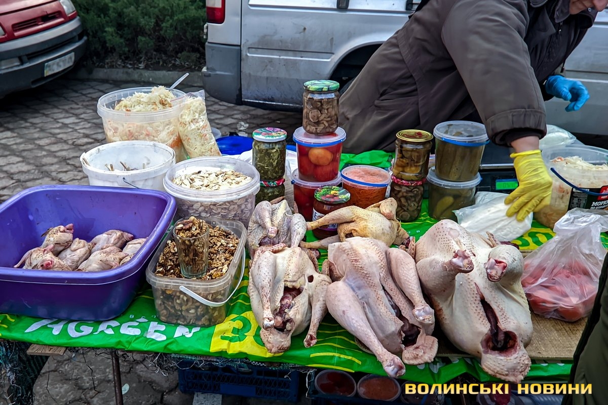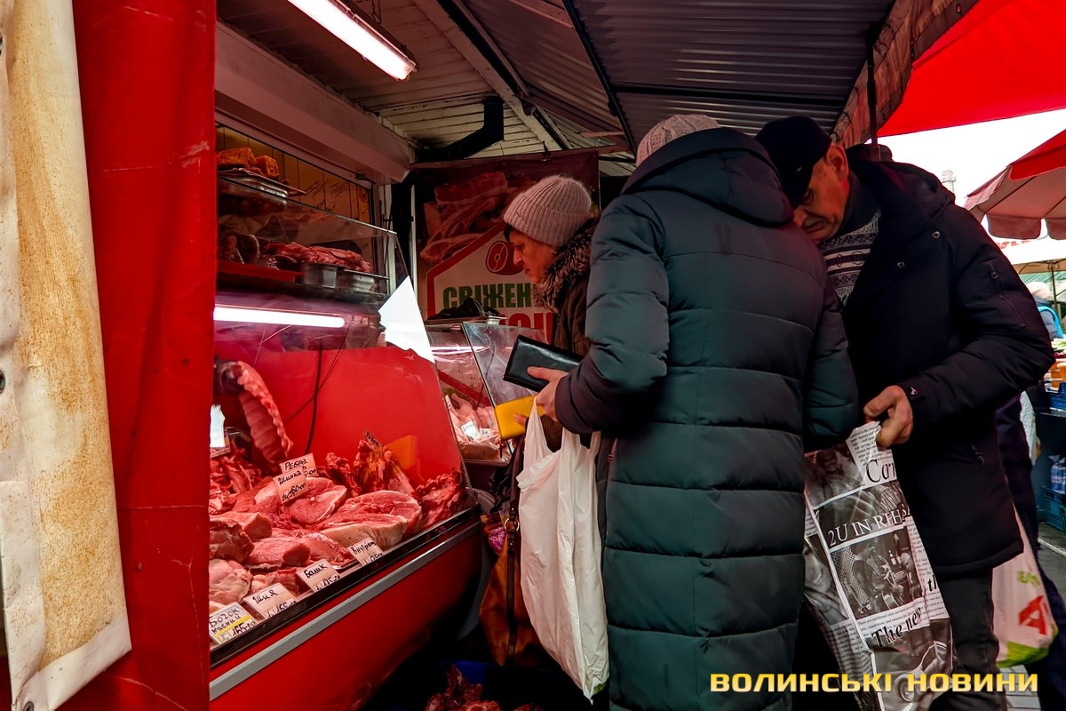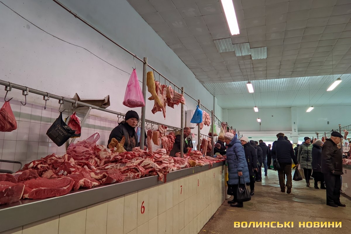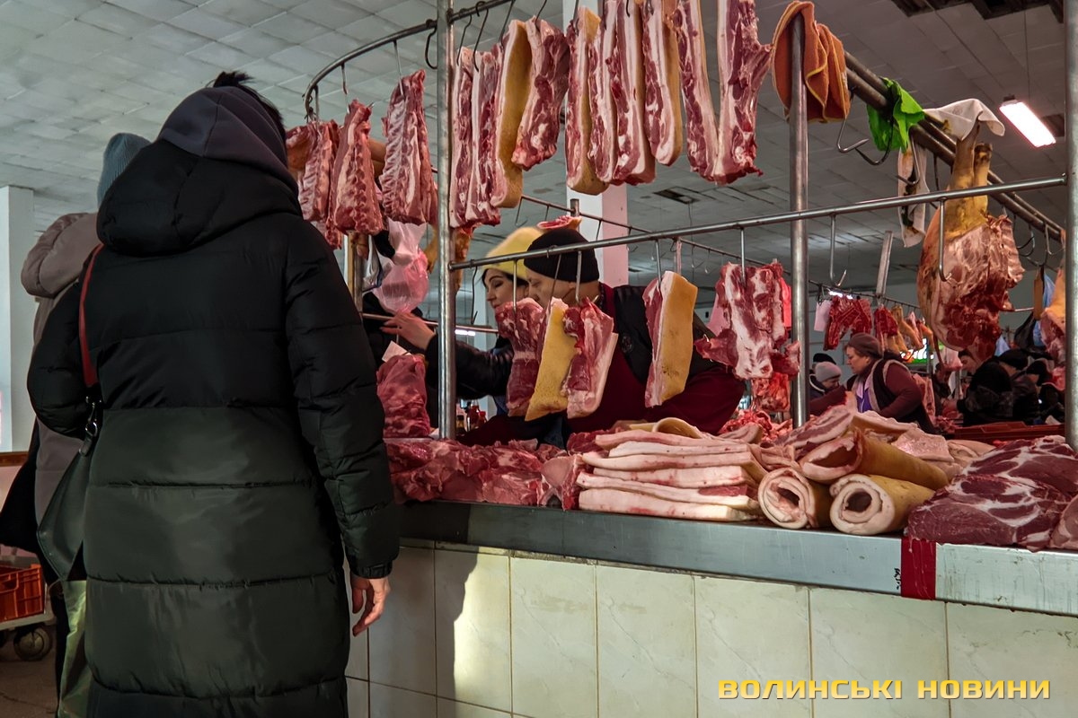 Ярмарок біля «Глобуса» традиційно зустрічає лучан найбільшим різноманіттям крафтової продукції. Раніше її назвали б просто домашньою. Звісно, напередодні Нового року люди найбільшу увагу звертають на м’ясні вироби. Проте загалом покупців на ярмарку доволі небагато, як на передноворічний день. Чи то війна далася взнаки, чи то ціни відлякують. Чесно кажучи, у звичайну суботу буває значно більше людей.Тим не менше торг іде. Свинячу печінку пропонують по 70 гривень. Шинка йде по 180 гривень. За лопатку просять 180 гривень за кілограм. Вирізка коштує 175–180 гривень. В іншому місці вирізку віддають за 220 гривень (якщо купити цілий шматок, а він чималенький), якщо ж різатимуть, то треба заплатити вже по 240 гривень за кіло. Свинячі ребра коштують по 160 гривень. У кожного продавця м’ясива є бочок. Його пропонують за ціною 150–160 гривень.Не бракує й готової продукції, яку можна взяти одразу до столу. Печений бочок обійдеться у 240–270 гривень за кіло, ребра – у 250, ковбаса – у 300, шинка – 300–350. Можна купити й копчені вуха до пива – по 160 гривень за кіло. Готові ковбаси (на кшталт салямі, дрогобицької тощо) коштують 230–280 гривень. Любителі кров’янки можуть купити її по 110 гривень. Продавці пропонують її з гречкою та рисом. Картоплянка (терта картопля запечена у кишці) йде по 60–80 гривень. Сальтисон обійдеться у 150 гривень.Можна прикупити й домашньої сирої ковбаси, яка аж проситься на деко. Продають таку по 175 гривень. Сало залежно від товщини цінять по 160–190 гривень.А от на «Варшавці» потік покупців був куди більший. Ціни трохи відрізняються від ярмарку біля «Глобуса», але загалом теж без значних перепадів від продавця до продавця. Скажімо, свіже сало траплялося й по 200 гривень. Бочок ішов по 150–165 гривень. За шию просили 165 гривень за кіло. Свиняча лопатка коштувала 155 гривень, шинка – 160 гривень.. Домашня сира ковбаса – по 180 гривень.Лише поодинокі продавці пропонували телятину чи яловичину. Телячу шинку віддавали за 200 гривень. Стільки ж коштувала яловича. Хоча різні частини яловичої туші продавали й дешевше – було до продажу м’ясо і по 130 гривень.Пропонували селяни й курей та іншу птицю. Скажімо, за качку продавчиня просила 650–700 гривень. Півлітрова банка хрону (куди ж без нього!) коштує 70 гривень. За вполовину менший пакетик треба заплатити 35 гривень.