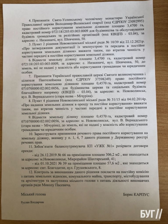 Депутат облради Андрій Бокоч звернувся до Волинської облради щодо позбавлення права оренди земельних ділянок, що знаходиться під церквами та храмами УПЦ мп на Волині. Зокрема, у Володимирському районі йдеться про Успенський собор, Зимненський та Низкиницький монастир.