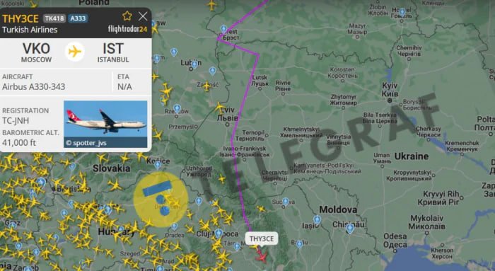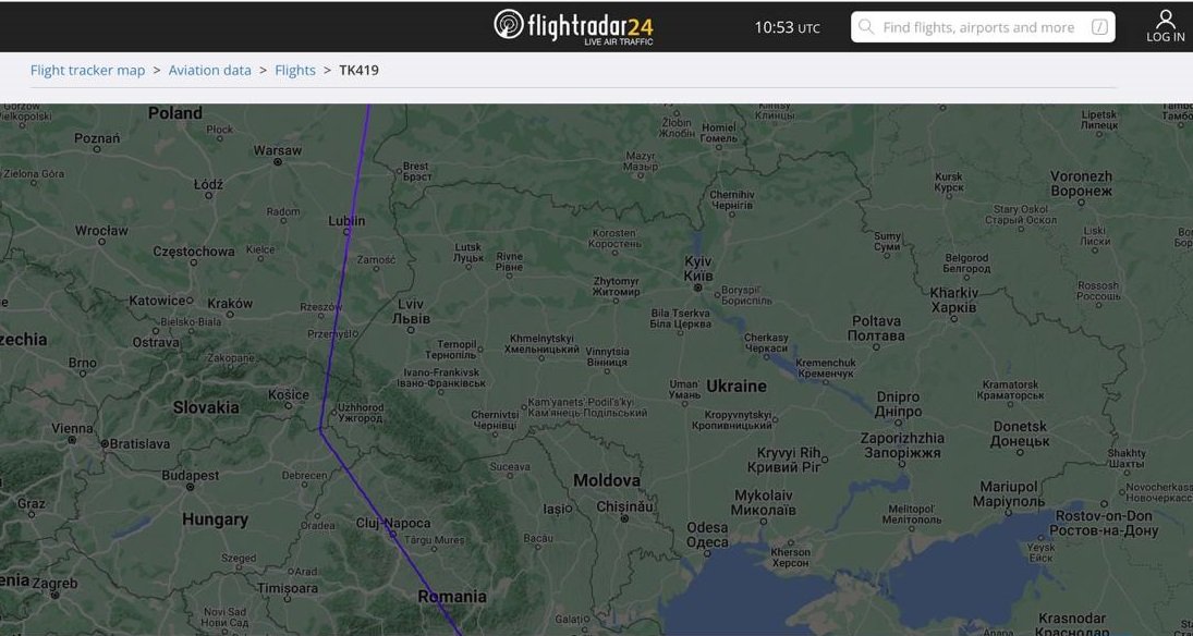 Друга публікація «Телеграфу» розповідає про рейс THY3CE/ТК418 авіакомпанії Turkish Airlines, що вилетів із Москви в Туреччину. Нібито 10 лютого літак пролетів над кількома областями, зокрема й над Волинською.