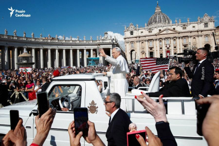 На площі Святого Петра у Римі зібрались десятки тисяч людей, а також низка світових лідерів, зокрема й президент України Володимир Зеленський, який прибув зі своєю дружиною Оленою.