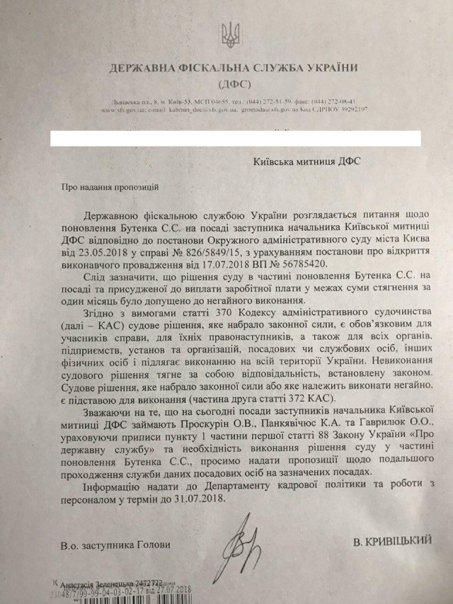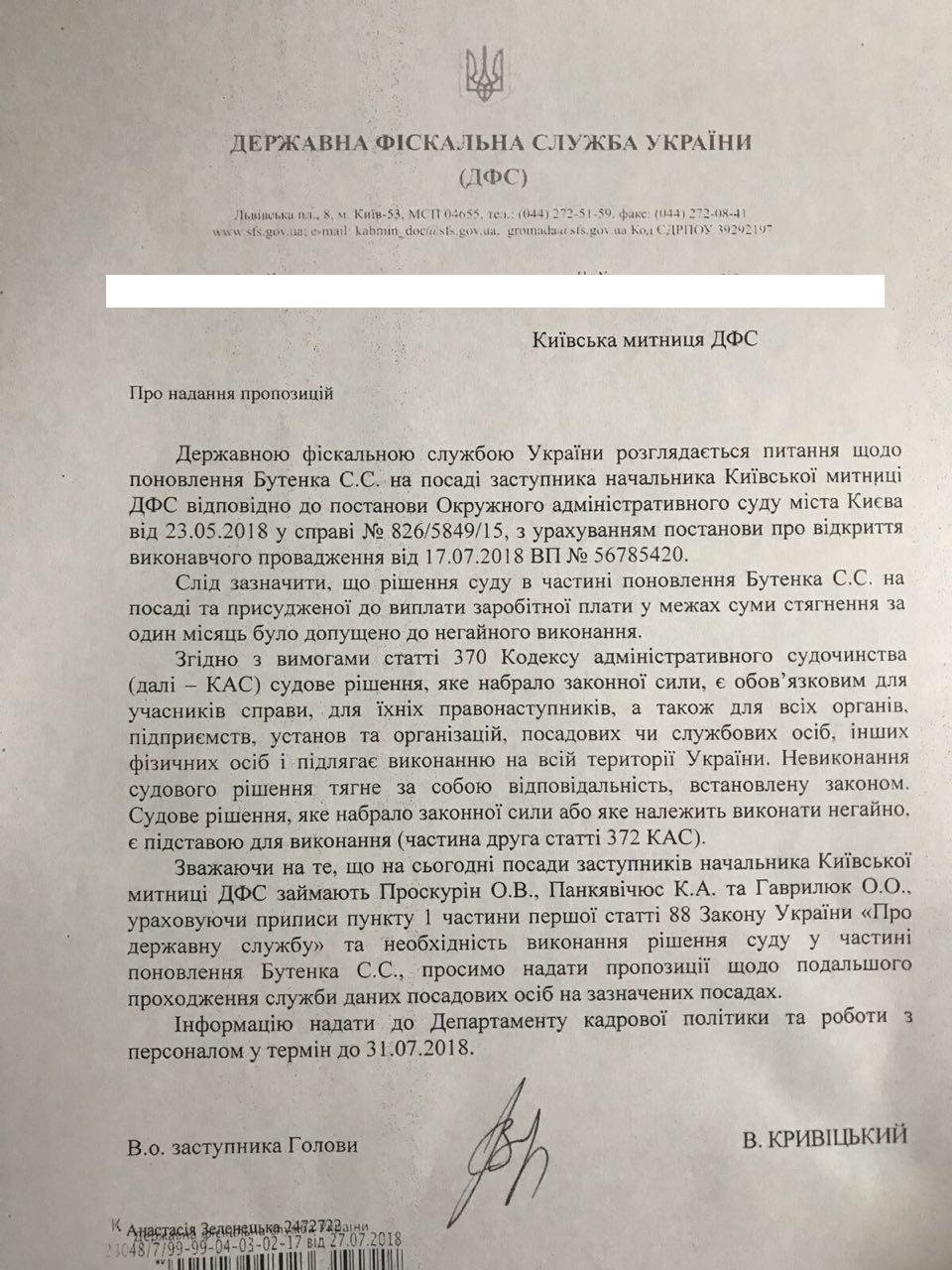 Таким чином, новопризначений начальник української митниці Віктор Кривіцький лобіює повернення на посаду люстрованого Бутенка, пов'язаного з найбільш одіозними фігурами української політики. Причому, виходячи з формулювань у листі, заради призначення Бутенка Кривіцький вимагає звільнити тих співробітників, які на сьогоднішній день законно працюють заступниками голови Київської митниці.