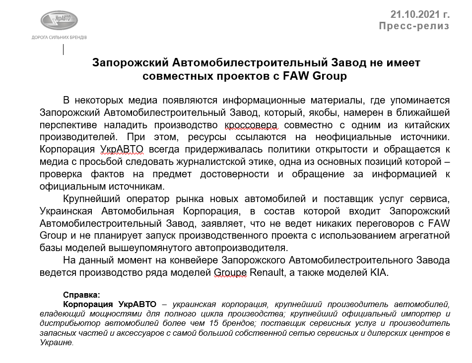 Як повідомили УНІАН у пресслужбі ЗАЗ, ця інформація є не достовірною.