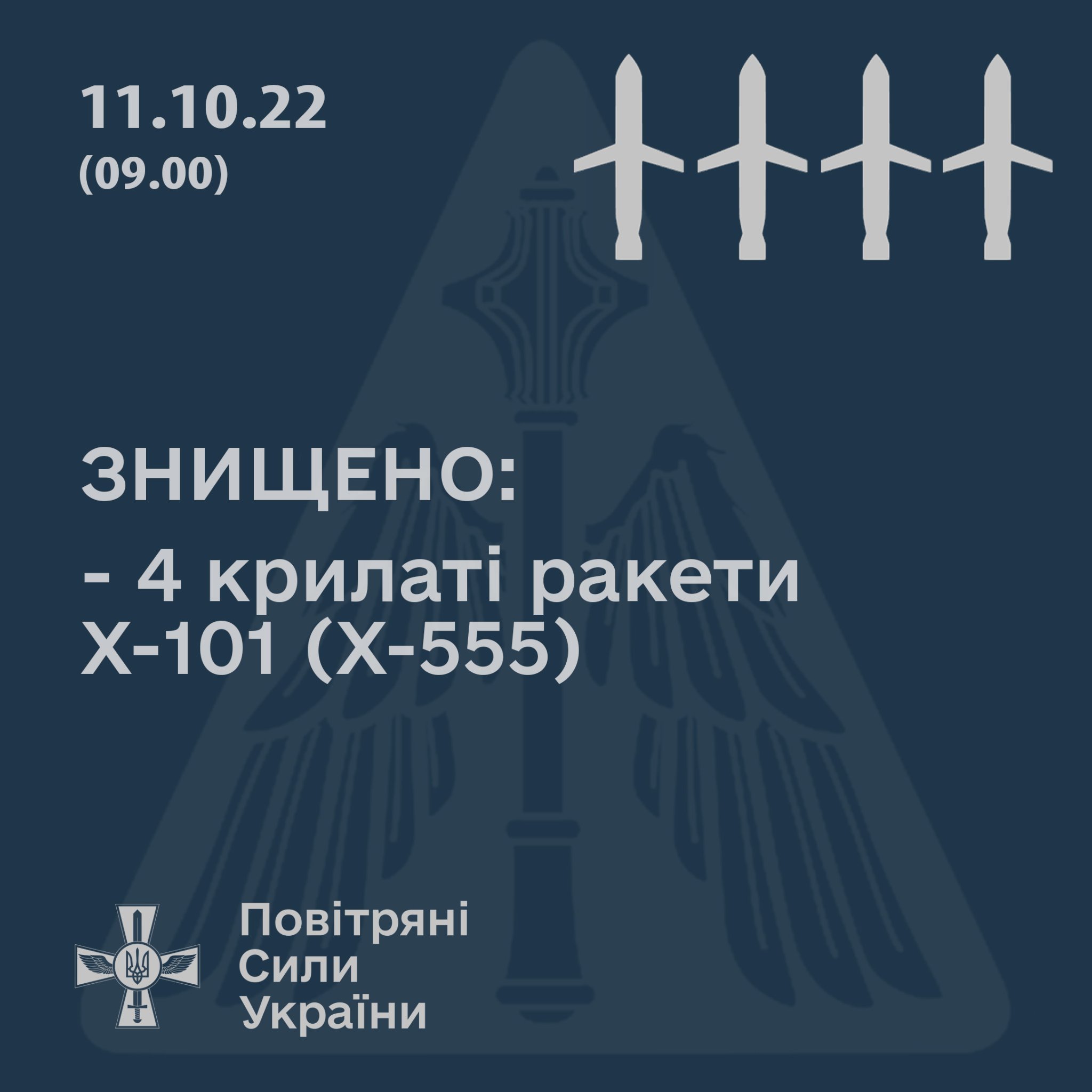 Близько 9.00 чотири ракети знищено силами та засобами Повітряного командування «Південь».