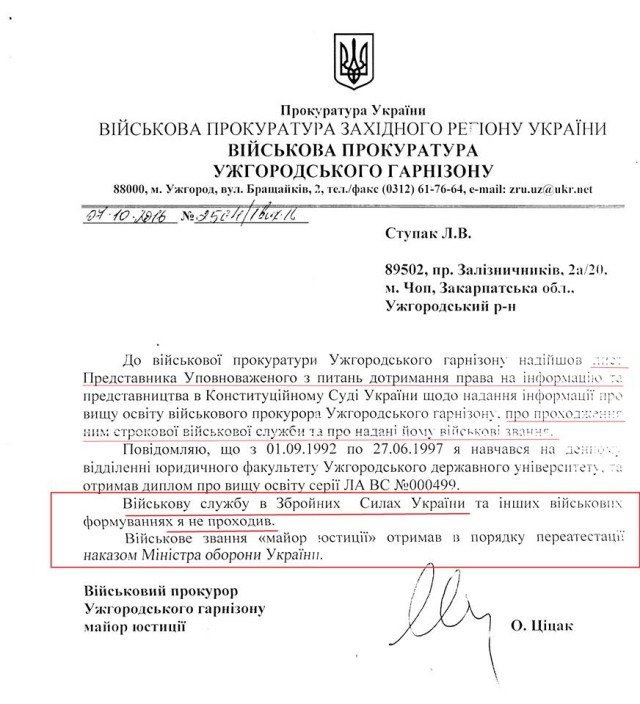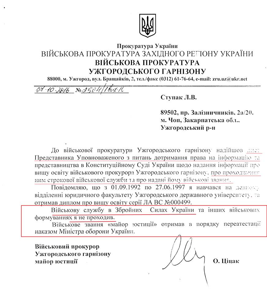 Видання Bihus.info пише з посиланням на закарпатську правозахисницю Ларису Ступак, що Ціцак не служив у Збройних силах України, а військове звання "майор юстиції" йому присвоїли 2015 року в процесі переатестації.