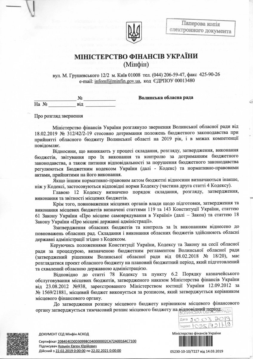 Зазначимо, як повідомили у Волиньраді, на їх звернення надійшла відповідь від Міністерства фінансів України, в якій йдеться, зокрема, про те, що рішення Волиньради про обласний бюджет – законне.Нагадаємо, попри доручення голови Волинської ОДА Олександра Савченка заблокувати виконання прийнятого бюджету на 2019 рік, департамент фінансів ОДА затвердив постійний розпис обласного бюджету та подав його в держказначейство, фактично розпочавши його виконання згідно з рішенням сесії Волиньради.