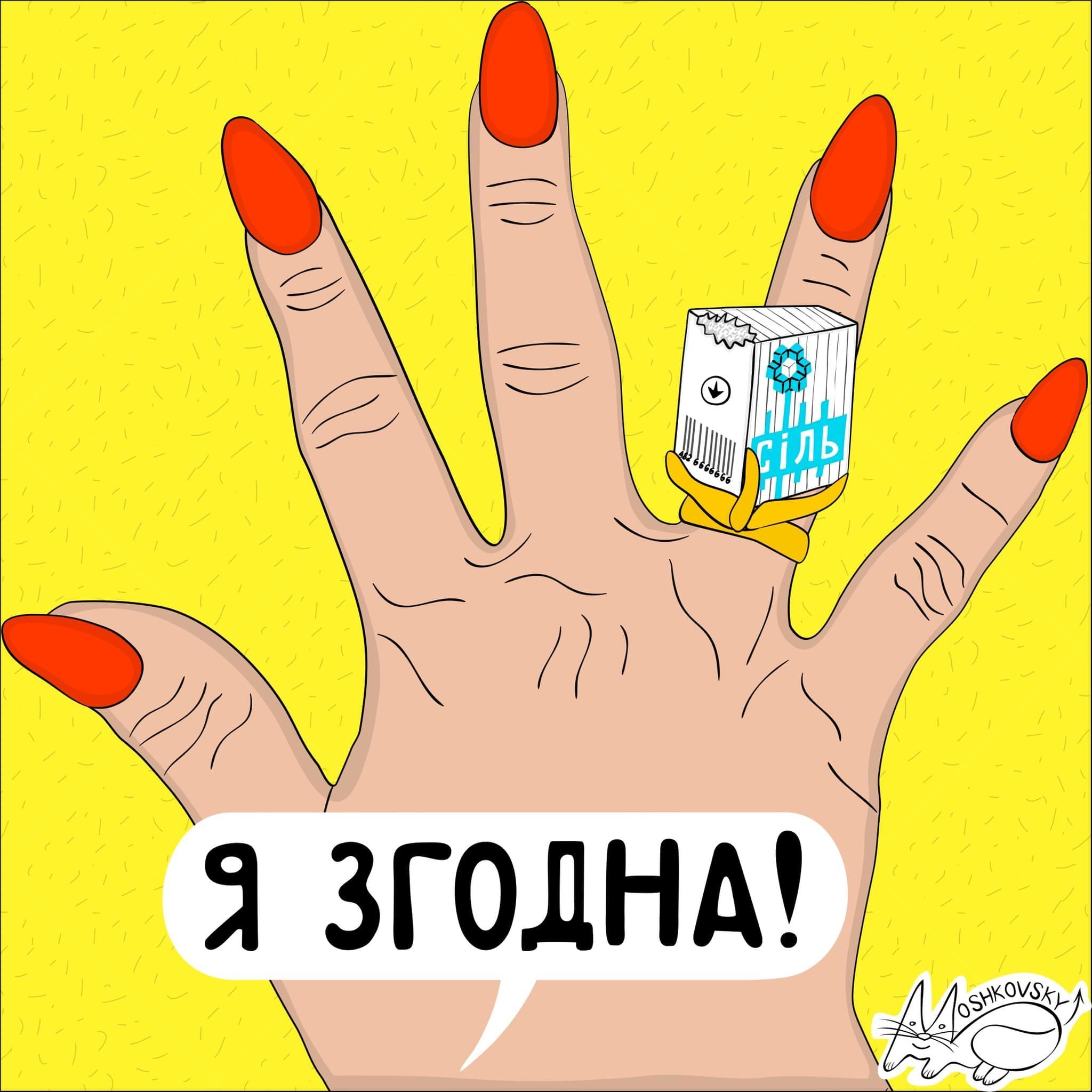 А український художник Максим Машковський намалював пачку дефіцитної солі у вигляді обручки.