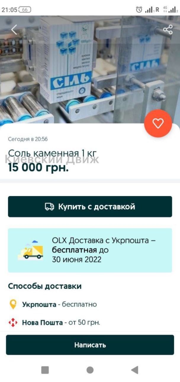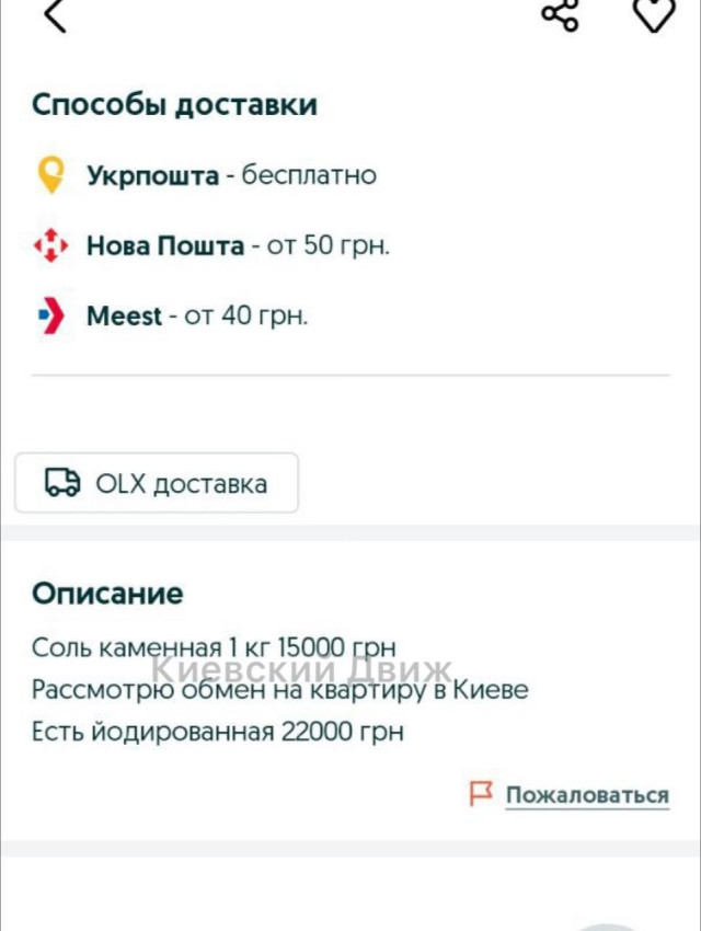 На сервісі оголошень OLX.ua один із користувачів запропонував продати кілограм солі за 15 тисяч гривень, або ж обміняти її на квартиру в Києві, повідомляє ТСН.