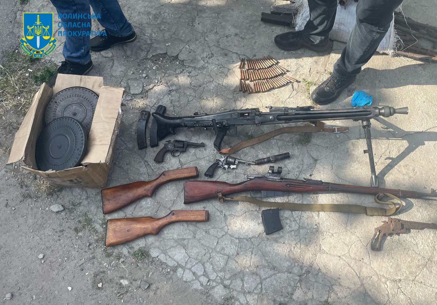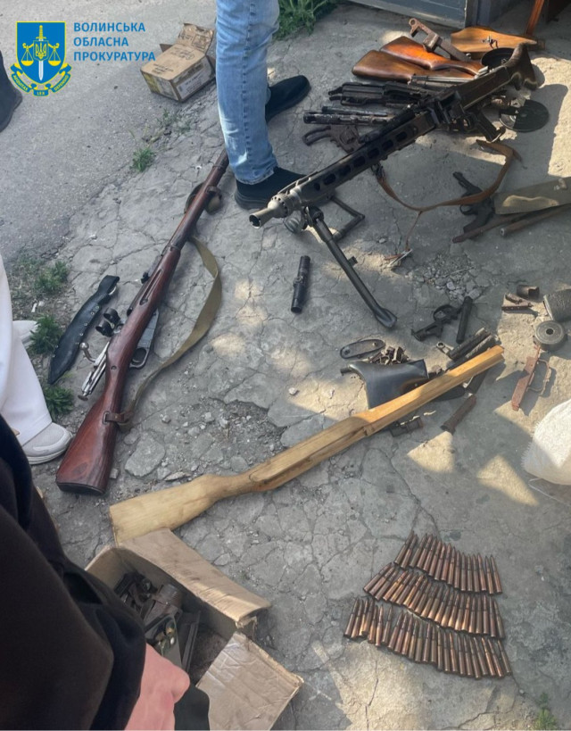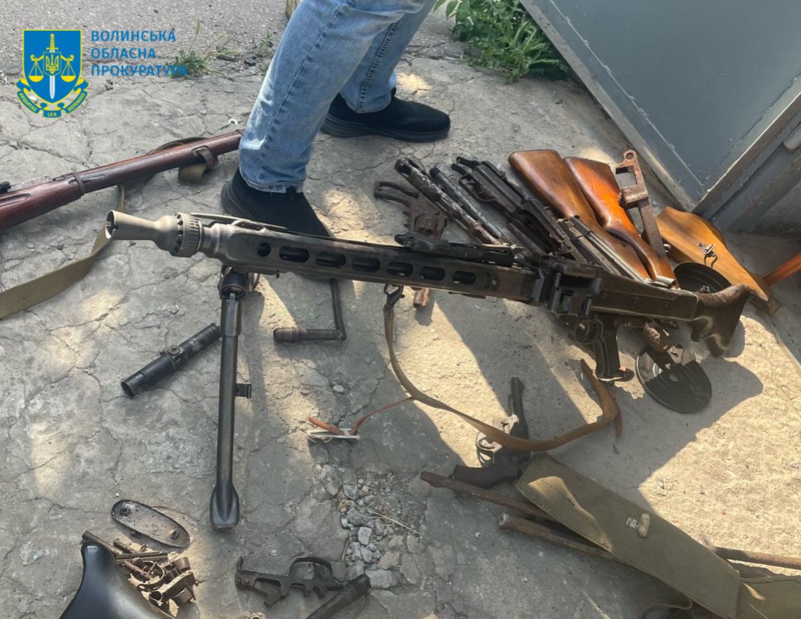 В ході обшуку в гаражі фігуранта виявлено та вилучено гвинтівку нарізну Мосіна з прицілом, кулемет MG3, два револьвери, патрони, два магазини до автоматичної зброї, 10 магазинів до кулемета, велику кількість деталей до зброї (приклади, стволи та ін.).
