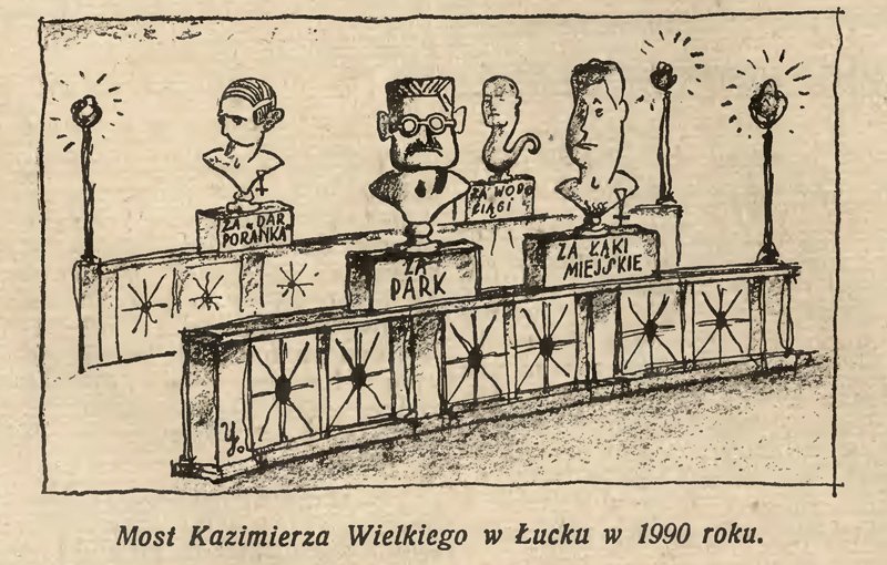 Значно пізніше, у 1935 році в газеті «Волинь» трапляється карикатура мосту. На ній замість наявних бюстів намальовані скульптури, імовірно, деяких ініціаторів міських проєктів з короткими підписами. Вочевидь це висміювання і критика реалізованих проєктів, які з якоїсь причини автору карикатури не подобалися.Тридцяті роки були часом дуже активного будівництва і розвитку в Луцьку. Проте плану розвитку міста, який впорядковував би різні сфери міського життя, ще не було. Його тільки розробляли й представили у 1937 році. Та обговорення різних аспектів відбувалося вже давно. У 1934 році архітектор Владислав Смігєльський виклав публічно деякі свої напрацювання щодо містобудівного розв’язку наболілих питань. До речі, саме його праця і лягла в основу плану розвитку міста на 30 років, який був готовий у 1937-му.