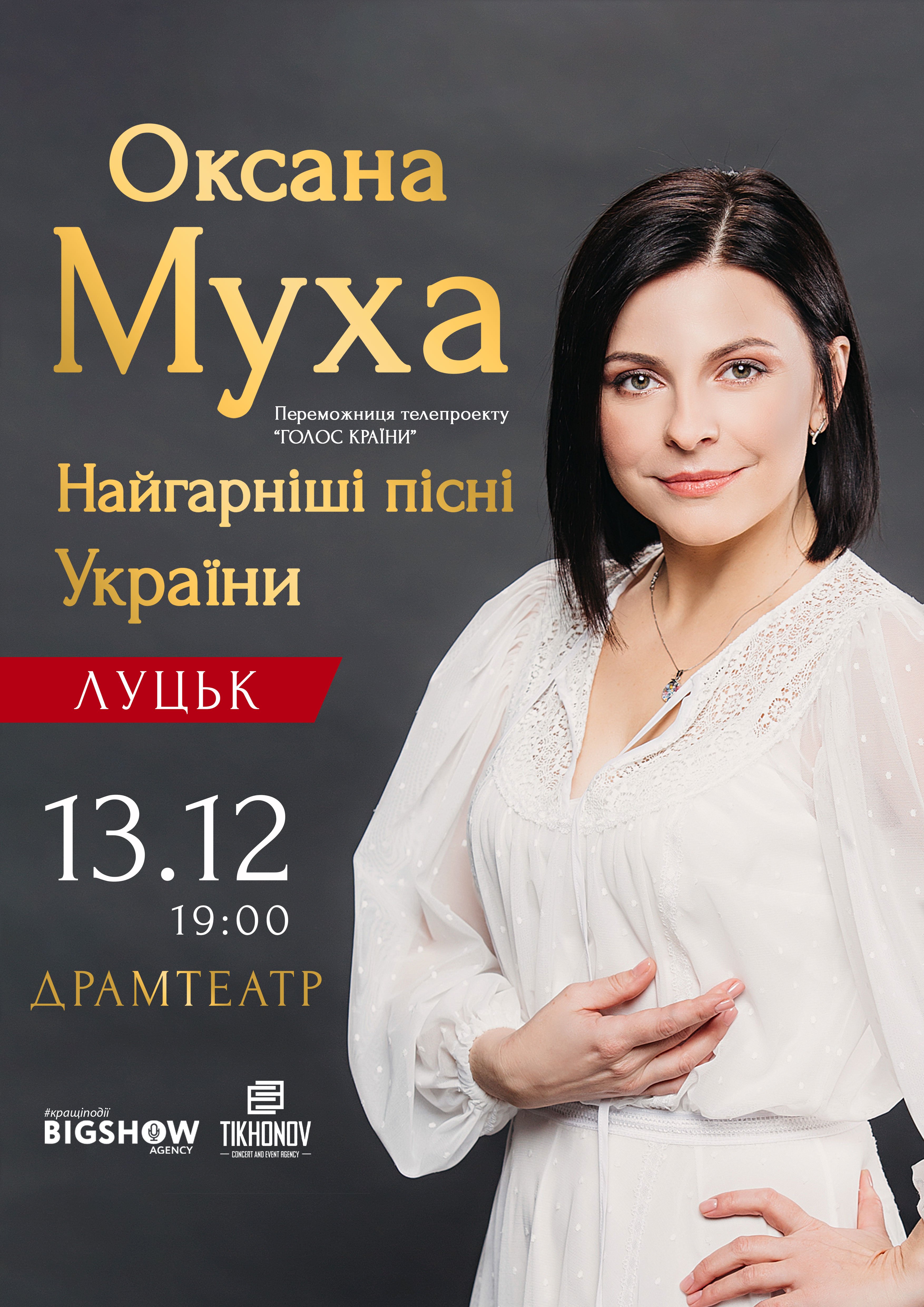 13-го грудня співачка Оксана Муха дасть великий сольний концерт «Найгарніші пісні України» у Луцьку.