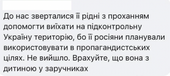 «Врахуйте, що вона з дитиною в заручниках», – зазначають волонтери.Раніше 2 квітня російські пропагандисти показали «інтерв’ю» з породіллею з Маріуполя Маріанною Вишемирською. Відео містить численні склейки. Нарізкою зі слів взятої в заручники породіллі окупанти намагалися підтвердити власну брехню про те, що в лікарні розміщувалася «база «Азова».