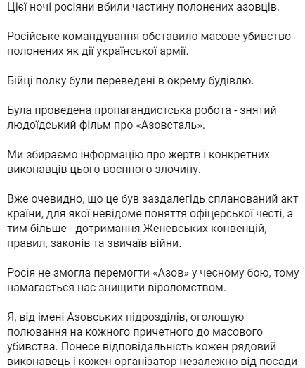 Колишній командир «Азову» Андрій Білецький заявив, що «азовці» оголошують полювання на кожного причетного до масового убивства в Оленівці. Він підтвердив, що росіяни там утримували бійців полку. За його даними, окупанти перевели їх в окрему будівлю, а потім її обстріляли.