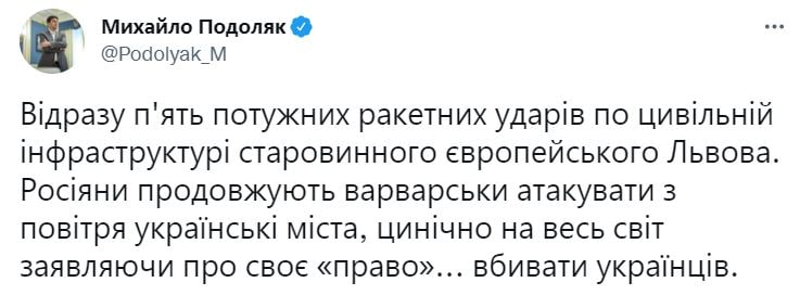 Радник голови Офісу президента Михайло Подоляк відреагував на ракетні удари по Львову та повідомив, що постраждала цивільна інфраструктура.В «Укрзалізниці» додали, що ситуація на львівському залізничному вокзалі контрольована, пасажири були розміщені в безпечних укриттях.