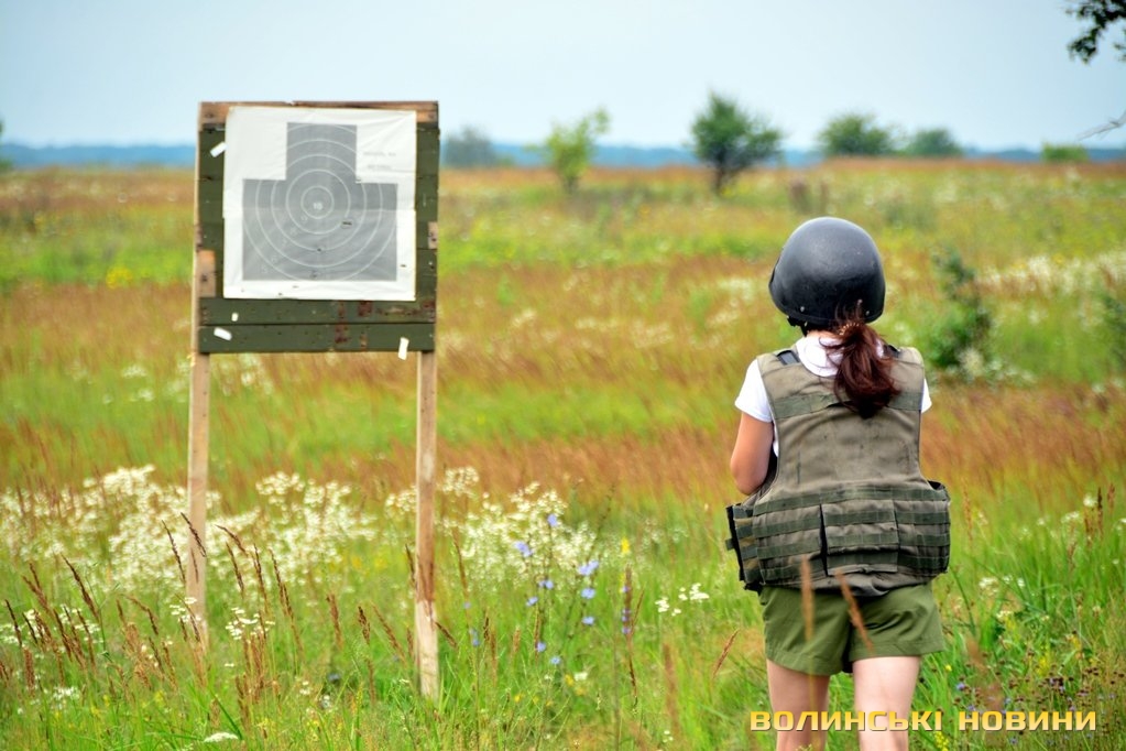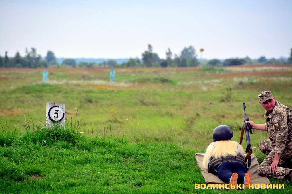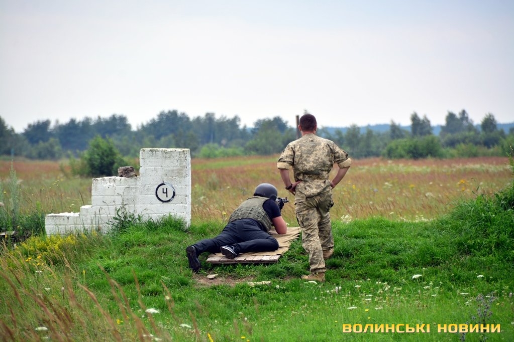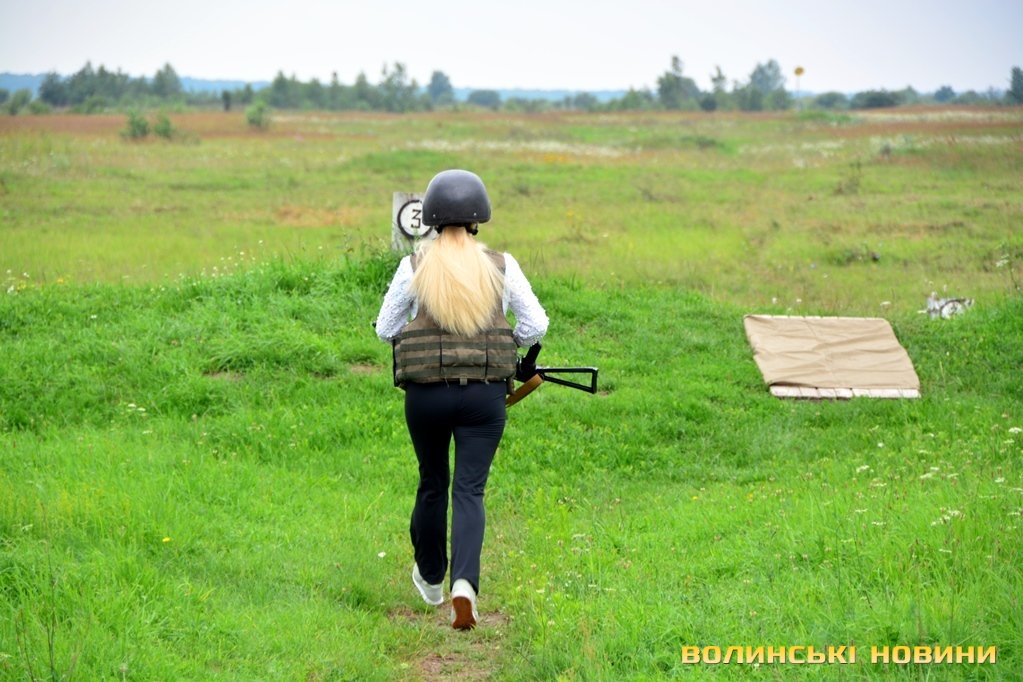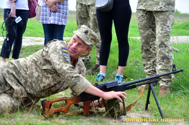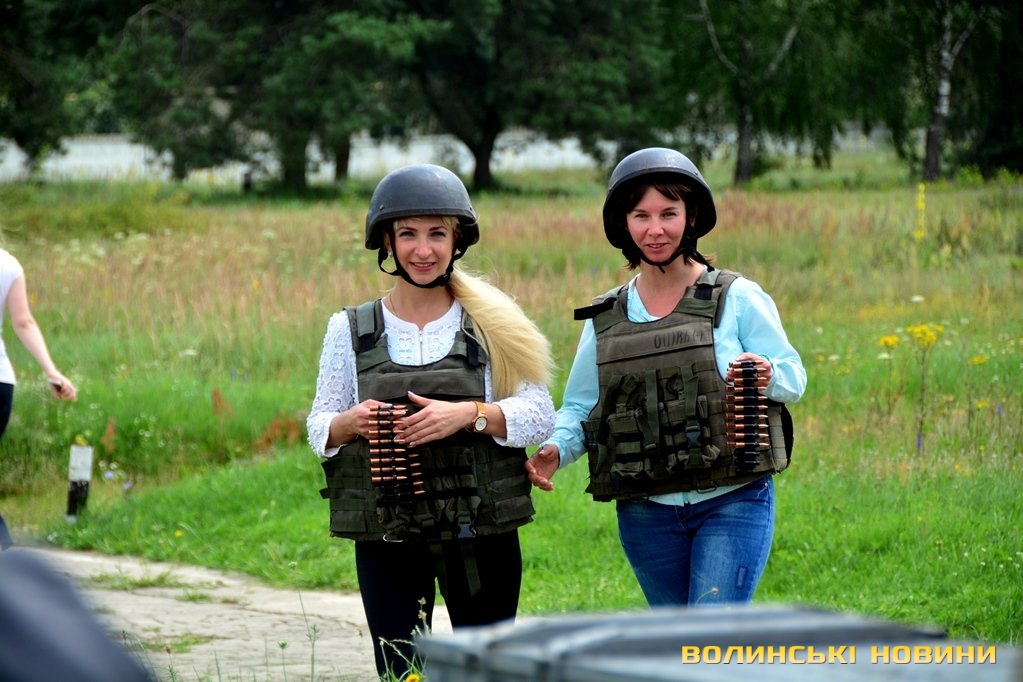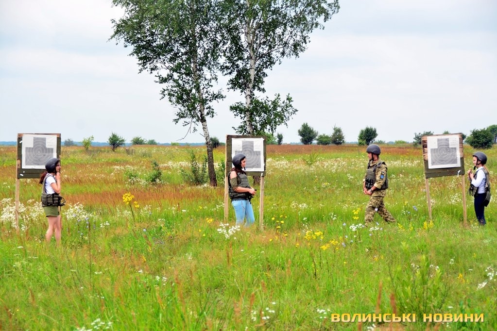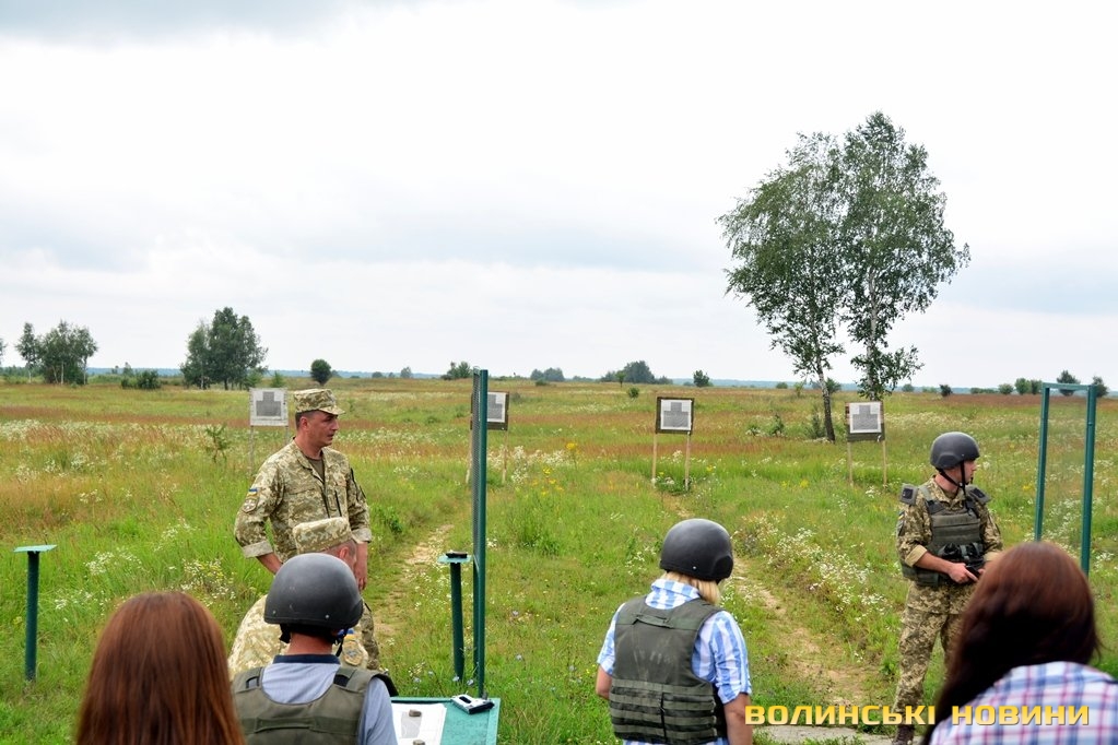 Спочатку волинських журналістів поділили на четвірки, а тоді вони змушені були надіти бронежилет та каску, і лише після цього вийшли на вогневий рубіж. Спочатку випробували стрільбу з АК-74 – кожному давався «ріжок» з двадцятьма патронами, аби влучити у рухомі цілі.Наступним видом зброї став пістолет Макарова. Здавалося, що стріляти з пістолета простіше, тим більше, що тепер у ціль потрібно було потрапити зі значно меншої відстані, аніж з автоматичної зброї, однак на практиці сталося зовсім інше – чимало представників ЗМІ не «вибило» жодного балу.Напевно, останніх стрільб очікували найбільше, адже всі хотіли спробувати у дії ПКМ – кулемет Калашникова модернізований, принцип стрільби з якого дещо відрізняється від звичайного АК. Тож, отримавши стрічки з 20 патронів, журналісти очікували своєї черги, аби вистрілити кількома чергами.В підсумку, як зазначили військові, результати волинських журналістів не дуже високі, але вони наголосили, що для того, аби досягти певного результату, потрібні постійні тренування, щоб набути навички.