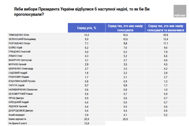 Соціологічна група «Рейтинг» з 16 листопада до 10 грудня проводила соцопитування в Україні щодо підтримки українцями кандидатів у президенти. Українці, які визначилися з кандидатом і мають намір голосувати на виборах 2019 року, сформували топ-10 лідерів президентської кампанії. У десятку увійшли як давно відомі політичні фігури( як от Тимошенко, Порошенко, Бойко, Гриценко, Ляшко), так і представники шоу-бізнесу (Зеленський, Вакарчук). З’явились у рейтингу і нові обличчя української політики.