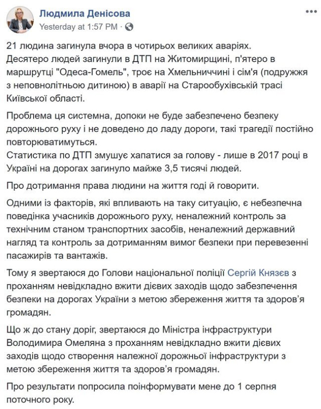 Проблема ця системна, допоки не буде гарантовано безпеку дорожнього руху і не доведено до ладу дороги, такі трагедії постійно повторюватимуться. Статистика щодо ДТП змушує хапатися за голову: лише в 2017 році в Україні на дорогах загинули майже 3,5 тис. осіб. Про дотримання права людини на життя годі й казати", - заявила Денісова.