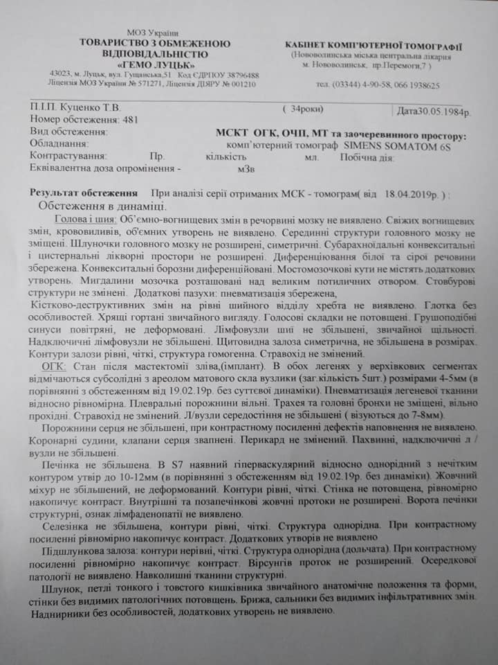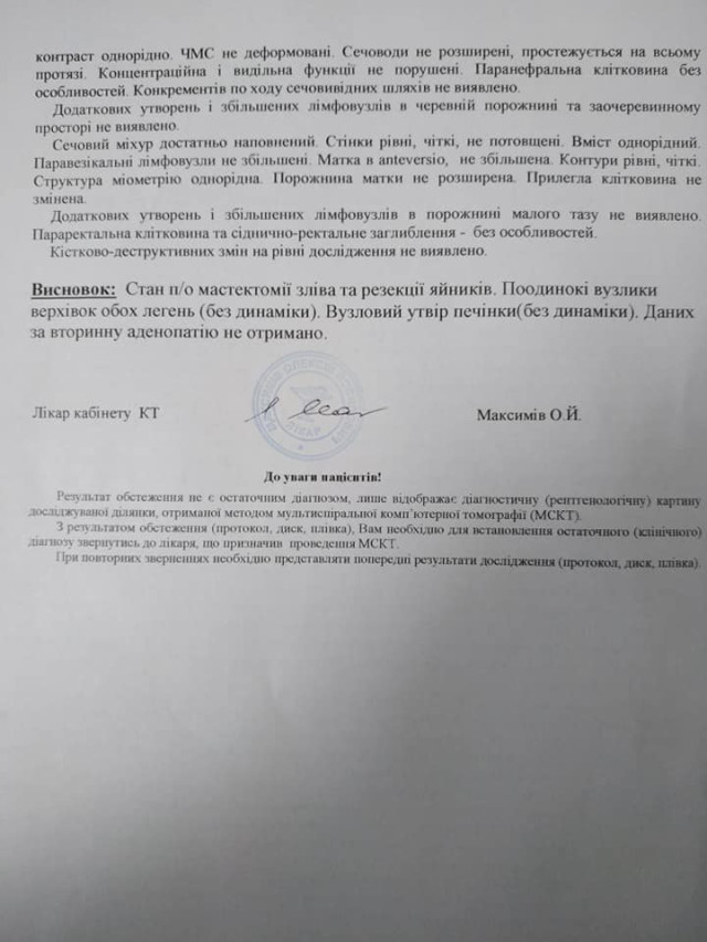«Слава Богу, лікування допомагає, динаміка без змін у печінці, але сама структура стала з неоднорідної однорідною, так само в легенях – з ареолом матового скла. Це означає, що метастази перетворюються в щось типу фіброзу чи рубця. Зараз я узгоджую питання про їх видалення лапараскопічне, якщо це буде можливо. Потрібно їхати на консультацію до Києва», – написала жінка.