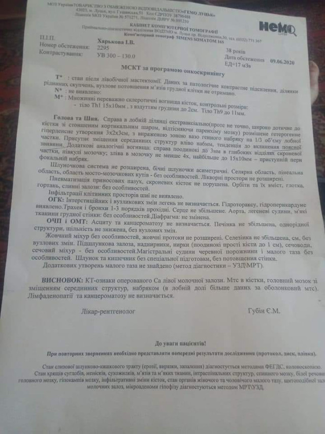 У Ірини діагностували пухлини у області хребта та ураження головного мозку. На завтра, 19 червня, їй призначили курс променевої терапії у Києві. Вартість курсу – від 50 тисяч гривень.