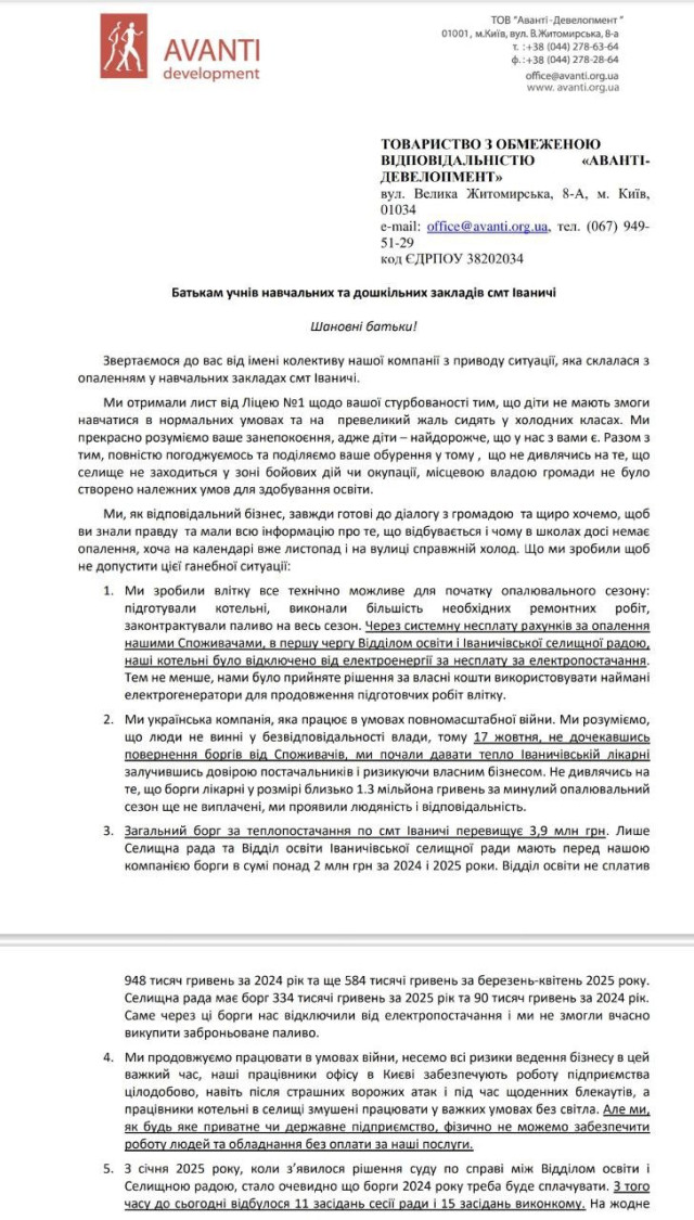 Опалення в комунальних установах Іваничів досі немає через конфлікт місцевої влади та ТОВ «Аванті-Девелопмент», яке опалює бюджетні заклади громади, використовуючи альтернативні джерела енергії.
