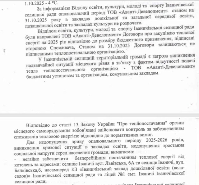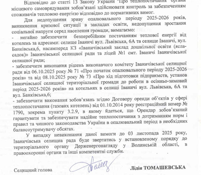 Водночас ми надіслали всі необхідні документи, надали юридичні консультації, запропонували підписати договори, акти звірки, реструктуризації боргів тощо. Ми йшли назустріч на всіх етапах, але таких же кроків задля залагодження опалювальної кризи від влади селища, на жаль, досі немає. Ми не можемо вплинути на місцеву владу, щоб вони виконували свої прямі обов’язки», – зазначив теплопостачальник.До слова, 17 вересня під час наради за участю голови Володимирської районної військової адміністрації Юрія Лобача розглянули питання забезпечення теплом Іваничів. І тоді очільниця Іваничівської громади Лідія Томашевська запевнила, що частину боргу за 2025 рік, а це більше мільйона гривень, виплатять. 30 жовтня на сесії селищної ради депутати виділили на оплату опалення понад два мільйони гривень. Однак гроші на рахунок теплопостачальника не надійшли і досі.
