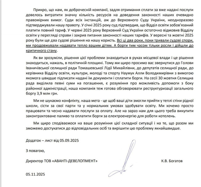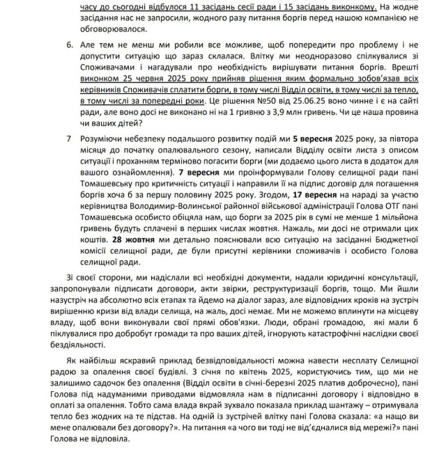 «Якщо в березні і квітні 2025 року тепло в школі і садочку було, але документів на 585 тисяч гривень в казначействі від відділу освіти за цей період немає, то про що це каже? Про те, що не було тепла, чи про те, що немає боргів? А може, про те, що хтось навмисно створює ситуацію несплати і конфлікту? Те саме стосується і приміщення селищної ради. З січня по квітень 2025 року вони були з теплом, але договору досі немає. Відповідно, акти за тепло подати неможливо. Тоді і 340 тисяч боргу за тепло теж, виходить, немає?» – обурився теплопостачальник.