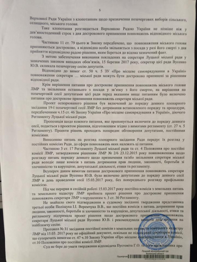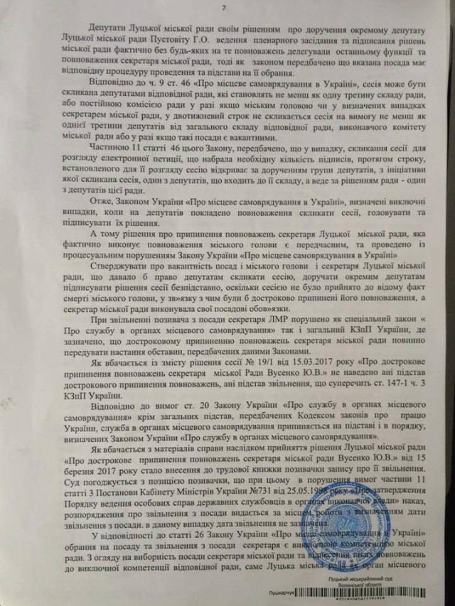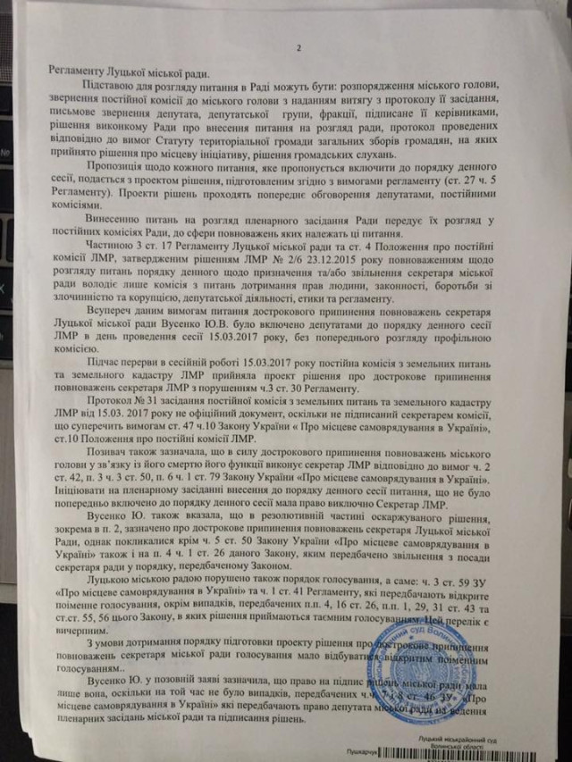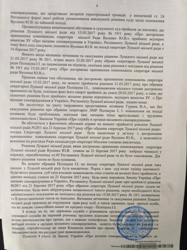 Звільнення Поліщука І.І з займаної посади, як і виконання рішення суду щодо поновлення Вусенко Ю.В на посаді секретаря Луцької міської ради є виключно компетенцією Луцької міської ради та повинно вирішуватись на сесії Ради у визначеному чинним законодавством України та Регламентом Луцької міської ради порядку», - йдеться в офіційному документі, де зазначається, що саме рада уповноважена виконувати рішення суду щодо поновлення Вусенко на роботі.
