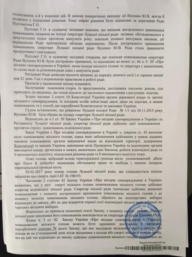 Повний текст рішення Луцького міськрайонного суду щодо справи Юлії Вусенко оприлюднив виконувач обов'язків міського голови Ігор Поліщук.