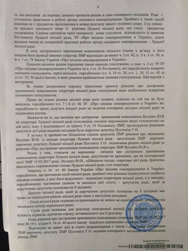 Так, суд частково вимогу екс-секретаря міської ради Юлії Вусенко задовольнив: визнав нечинним та скасував рішення Луцькради про дострокове припинення її повноважень. В решті позовних вимог – відмовив. Зокрема, не скасував рішення міськради про обрання секретарем міськради Ігоря Поліщука (УКРОП).