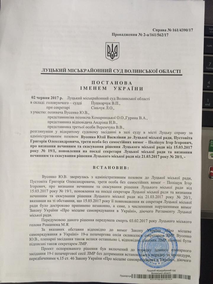 Так, суд частково вимогу екс-секретаря міської ради Юлії Вусенко задовольнив: визнав нечинним та скасував рішення Луцькради про дострокове припинення її повноважень. В решті позовних вимог – відмовив. Зокрема, не скасував рішення міськради про обрання секретарем міськради Ігоря Поліщука (УКРОП).