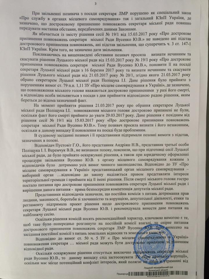 Звільнення Поліщука І.І з займаної посади, як і виконання рішення суду щодо поновлення Вусенко Ю.В на посаді секретаря Луцької міської ради є виключно компетенцією Луцької міської ради та повинно вирішуватись на сесії Ради у визначеному чинним законодавством України та Регламентом Луцької міської ради порядку», - йдеться в офіційному документі, де зазначається, що саме рада уповноважена виконувати рішення суду щодо поновлення Вусенко на роботі.