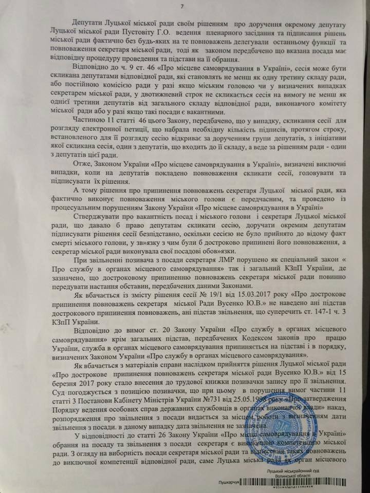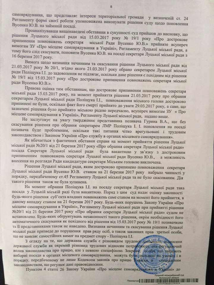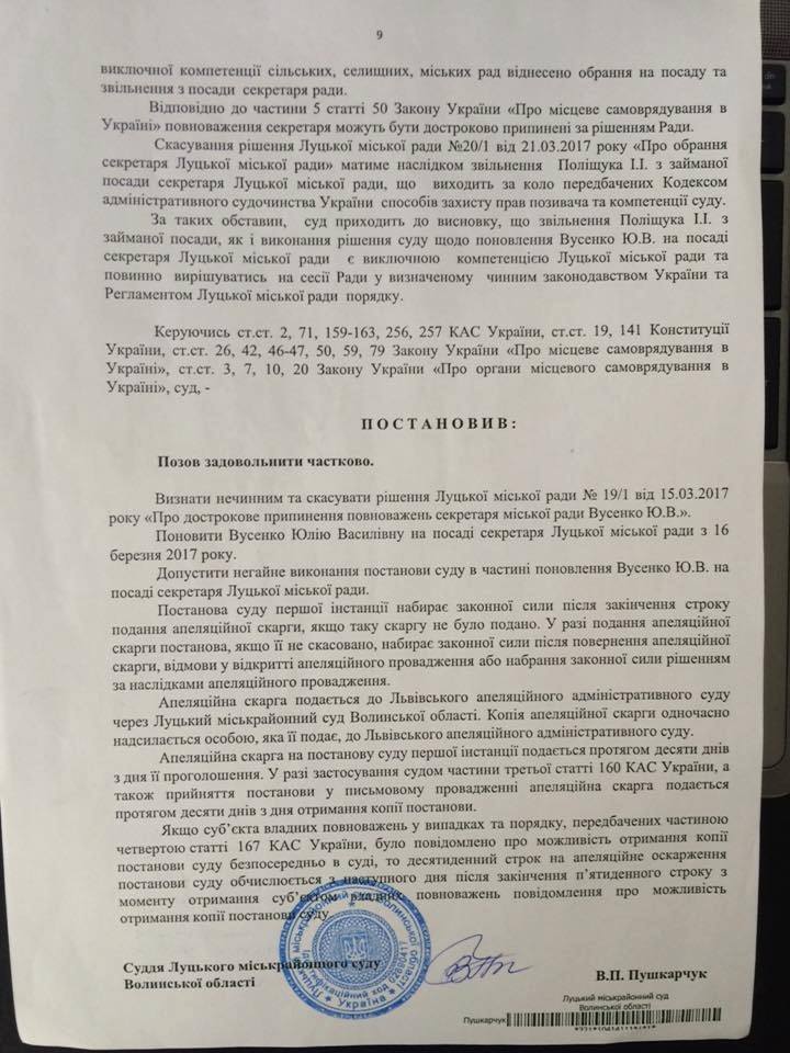 Уважно читайте резолютивну частину судового рішення, в якій йдеться: Допустити НЕГАЙНЕ(!!!) виконання постанови суду в частині поновлення Вусенко на посаді секретаря луцької міськради...... Рішення суду є ОБОВ"ЯЗКОВИМ до виконання усіма підприємствами, організаціями, установми фіз/юр особами....