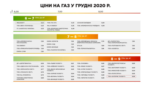 Відзначається, що в листопаді найменшу ціну своїм споживачам запропонувала енергетична компанія MEGAWATT – 6,22 грн за куб.м, далі зі схожою ціновою пропозицією йдуть компанія ВКФ «Теплобуд» – 6,25 грн за куб. м, а також «газопостачальна компанія «Нафтогаз України», яка забезпечує газом близько 2,5% споживачів – 6,33 грн за куб. м, залишивши ціну на рівні листопадової. Компанія «Газ АП» знизила ціну до рівня 6,33 грн за куб. м.