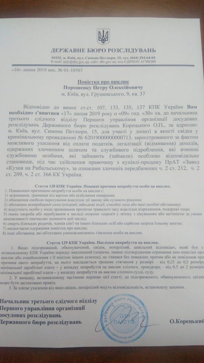 Мета виклику – участь у допиті в якості свідка у кримінальному провадженні № 62019000000000713 щодо можливого ухилення від сплати податків, відмивання злочинних доходів під час купівлі-продажу заводу «Кузня на Рибальському».Раніше стало відомо, що Державне бюро розслідувань викликає на допит 17 липня п’ятого президента України Петра Порошенка.