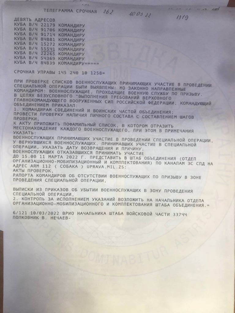 Також із документів випливає, що при перевірці учасників російсько-української війни були виявлені незаконно направлені в Україну строковики. Проте документ не містить вказівок повернути солдатів додому.Також російське командування наказує скласти окремий список військовослужбовців, які відмовилися брати участь у бойових діях проти України.