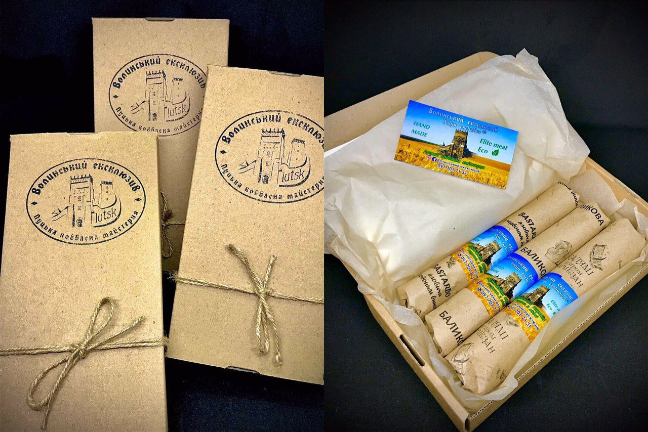Уже більш як рік підприємець Андрій Дорофеєв виготовляє оригінальні, крафтові сиров’ялені вироби, які об’єднав назвою «Волинський ексклюзив». А що особливо актуально напередодні свят – тут можна замовити подарункові набори в авторській оригінальній упаковці.Сьогодні асортимент налічує 8 видів ковбаси та 3 види м’яса, які можна замовити і уже в сформованих наборах, і обрати за своїми вподобаннями. У вартість сформованих наборів входить ціна за доставку. Якщо ж формуєте набір індивідуально, доставка буде безплатна за замовлення від 500 гривень. Можна замовити послугу нарізки тоненькими слайсами та кейтеринг.