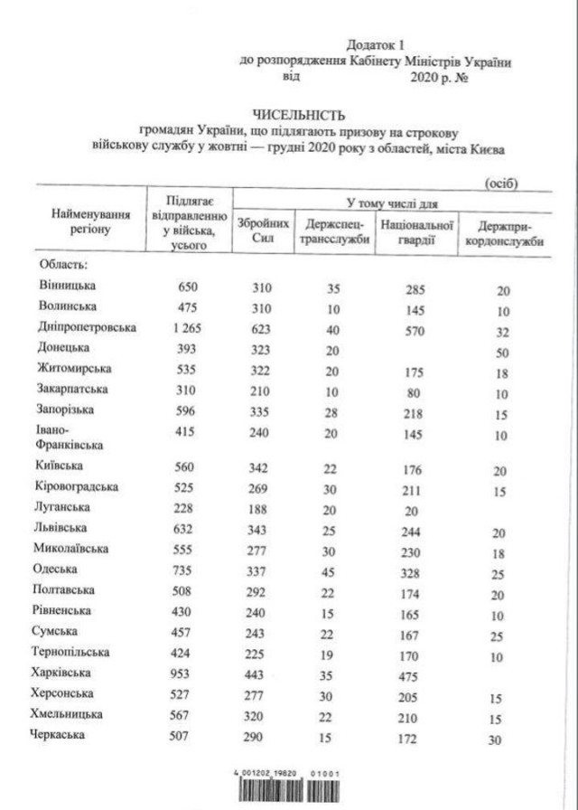 Кабінет Міністрів визначив чисельність громадян, які підлягають призову на строкову військову службу в жовтні–грудні 2020 року. Також уряд визначив обсяг видатків для проведення вищезазначеного призову та термін перерахування вищезазначених коштів.