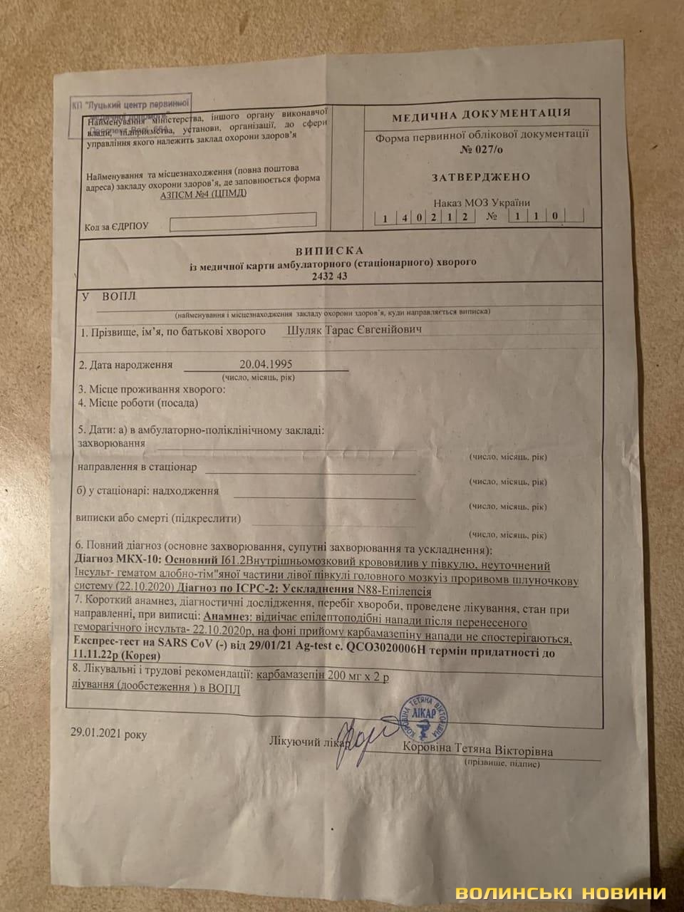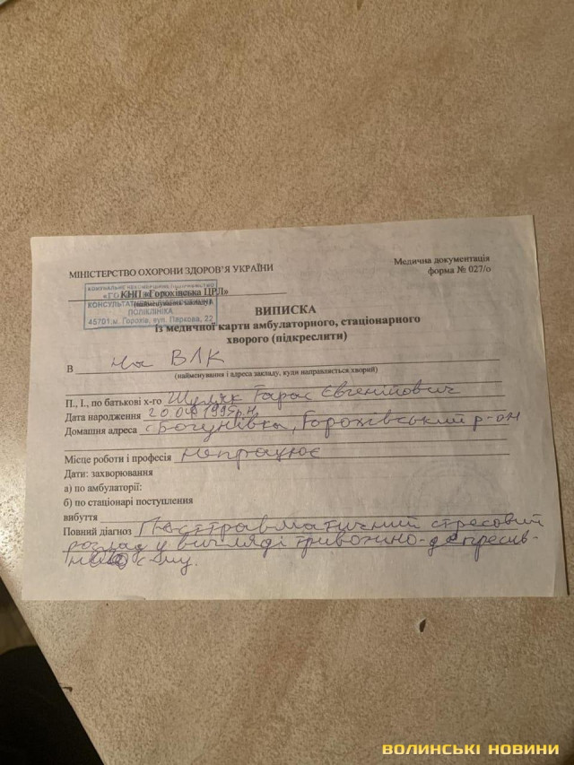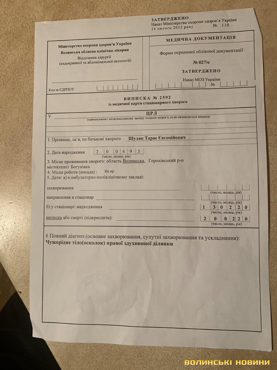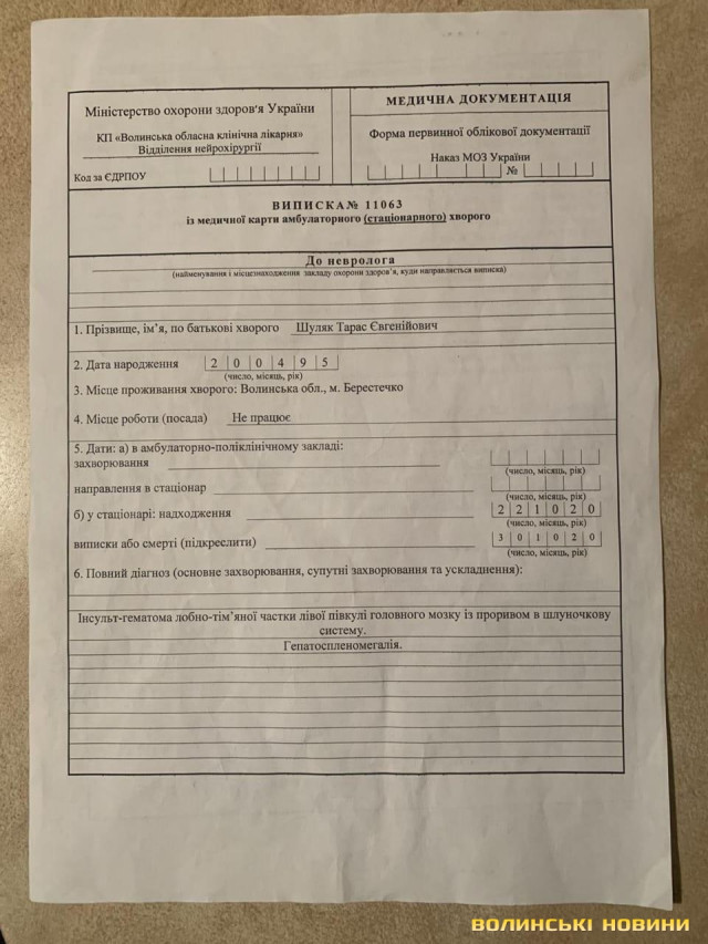 Наприкінці жовтня минулого року у волинянина погіршився стан, коли він перебував на вулиці, тоді ж його і доставили до лікарні. Він відчув запаморочення, слабкість та біль у правій руці і нозі, не міг пояснити, що з ним сталося. Як згодом з’ясувалося, у Тараса стався крововилив у мозок. Найбільш імовірною причиною називають осколок поблизу горла. До того ж під час падіння з висоти власного зросту він отримав травму голови.