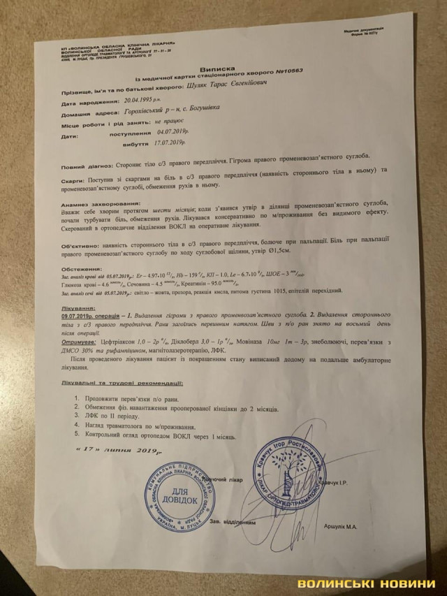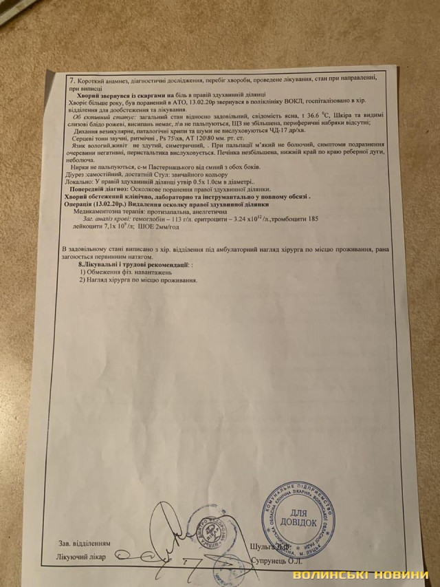 В той же день у відділені нейрохірургії Волинської обласної клінічної лікарні атовцю зробили операцію: видалили гематоми з тім’яної ділянки та поставили два імпланти.