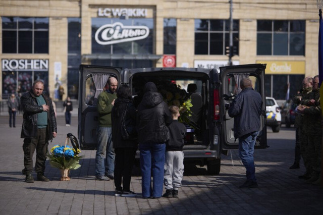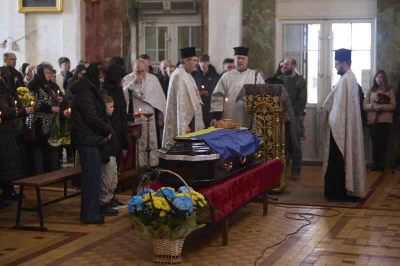 Після завершення заупокійного богослужіння труну з тілом захисника пронесли Театральним майданом. Біля Пам'ятного фотостенду загиблим Героям траурна процесія зупинилася і виконала Державний Гімн.