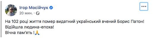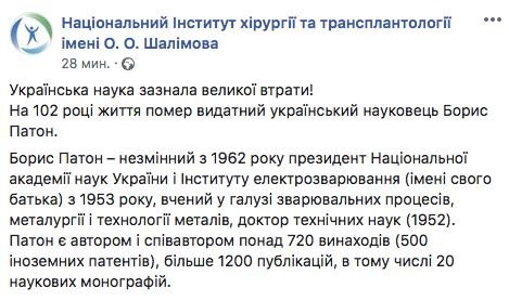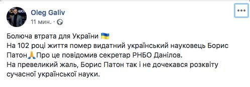 «Українська наука зазнала великої втрати! На 102 році життя помер видатний український вчений Борис Патон.