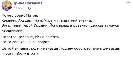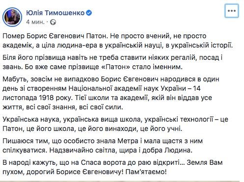 На превеликий жаль, Борис Патон так і не дочекався розквіту сучасної української науки ».Активістка Ірина Пугачова відзначила: «Це той випадок, коли не знаєш людину особисто, але відчуваєш якусь глибоку втрату».Екснардеп Ігор Мосійчук зазначив, що пішла з життя людина-епоха.Юлія Тимошенко відзначила, що українська вища школа - це Патон.Біографія і внесок Бориса Патона