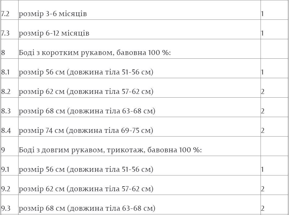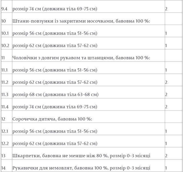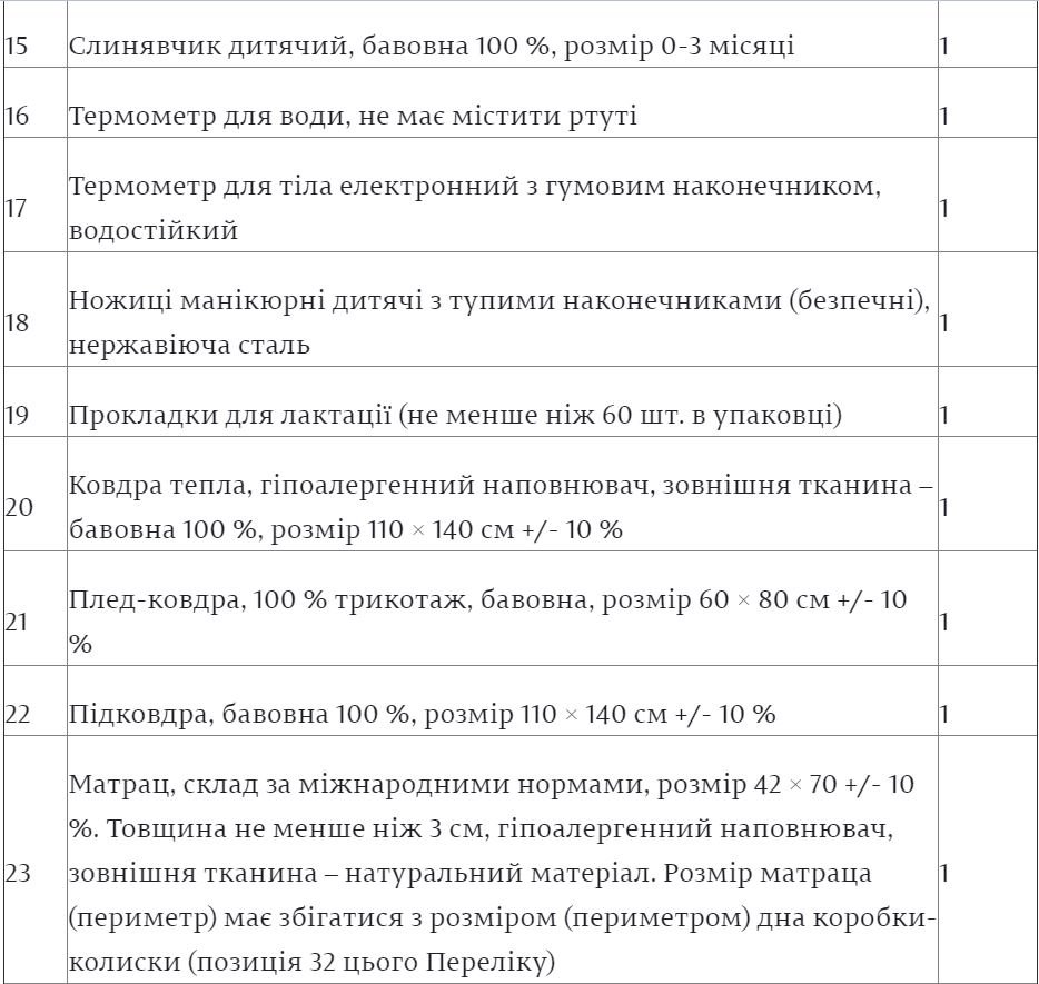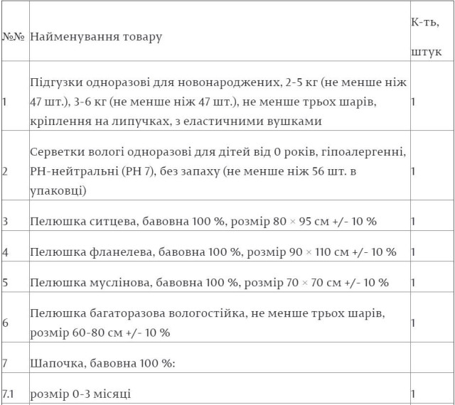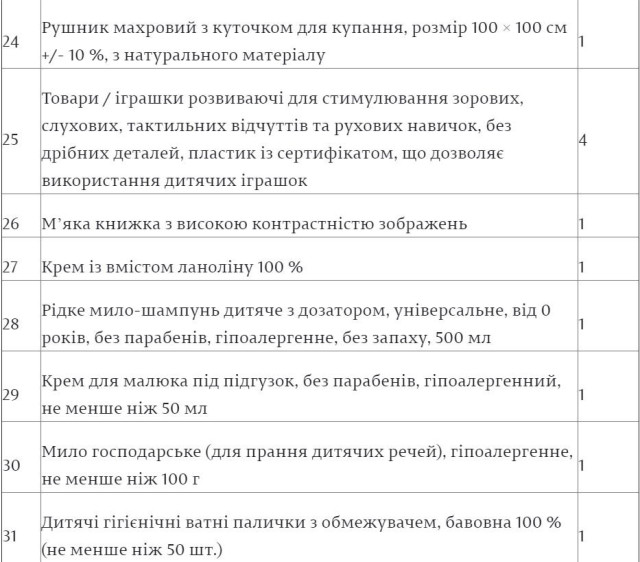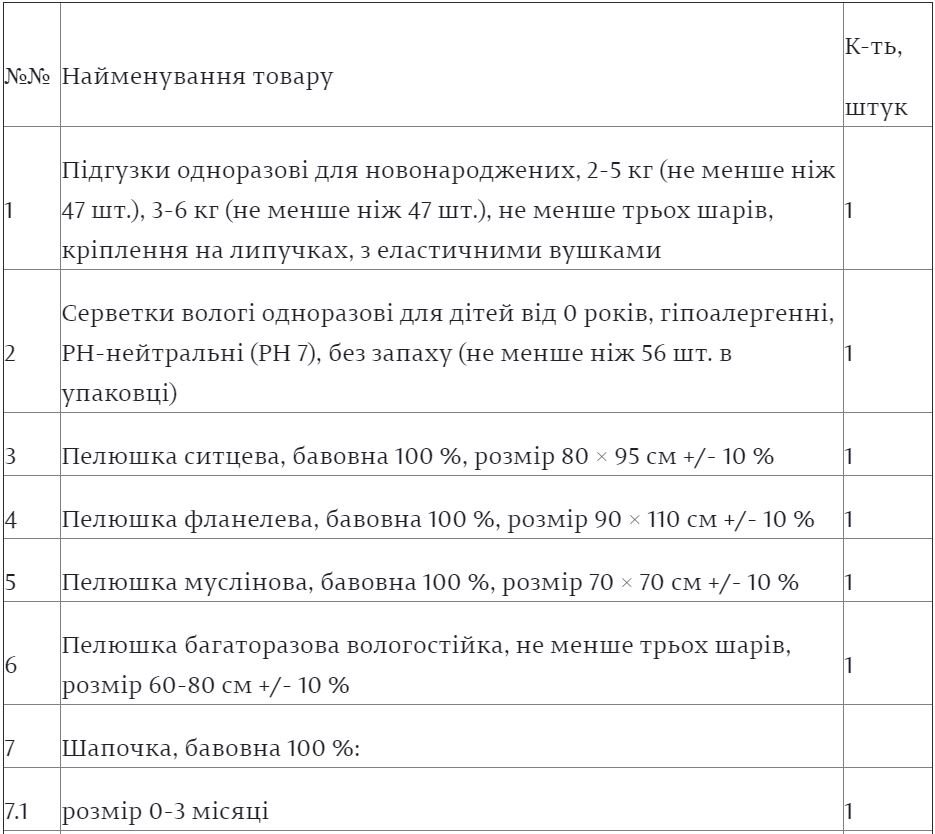 Згідно із опублікованою на сайті парламенту інформацією, до складу одноразової допомоги «пакунок малюка» входять такі предмети:«Пакунок малюка»: чи можливо отримати грішми